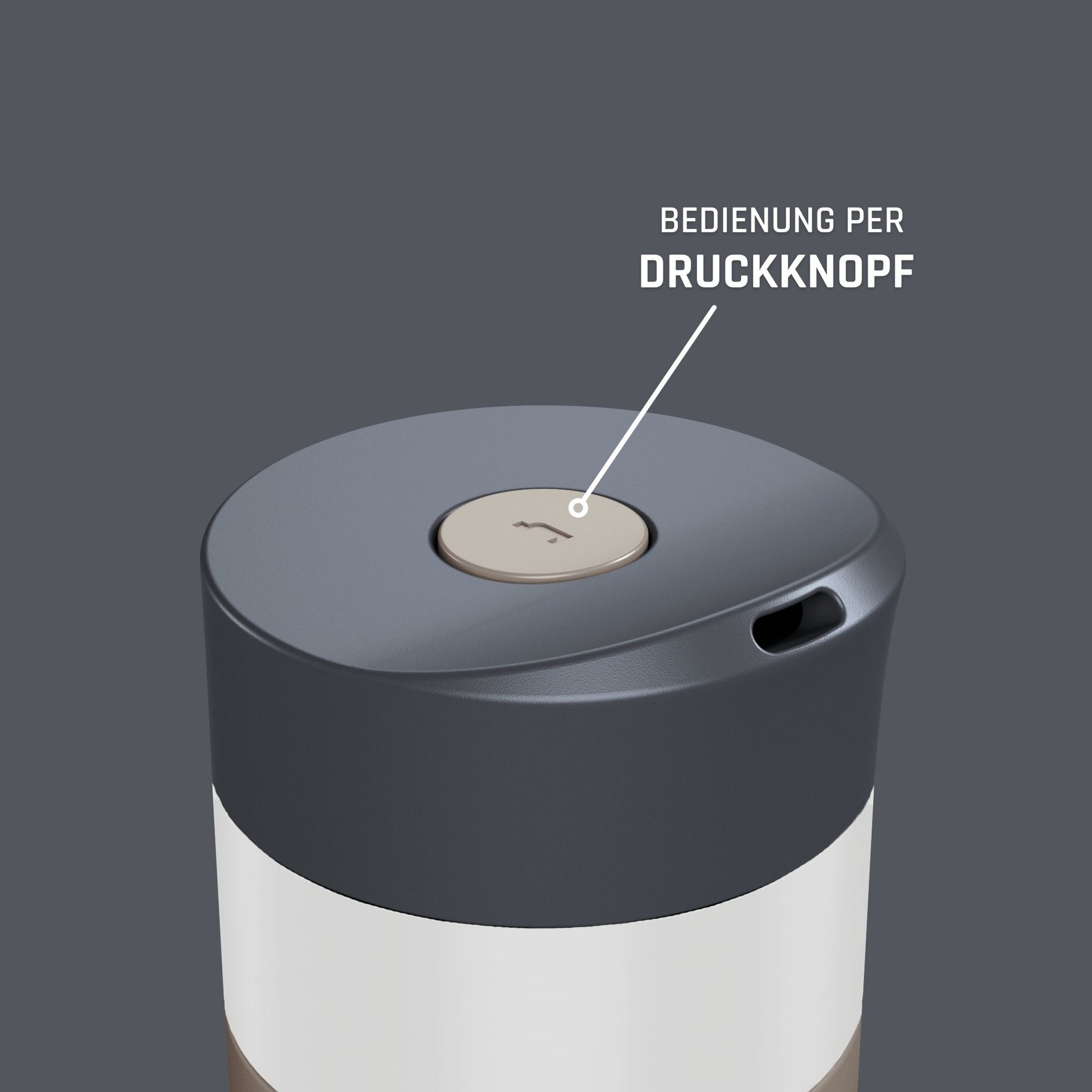 Der Thermobecher kann per Knopfdruck einfach mit einer Hand entriegelt und auch wieder geschlossen werden. Für eine einfache und gründliche Reinigung kannst du den Deckel einfach demontieren. Dafür die Verschlusskappe gegen den Uhrzeigersinn drehen und abschrauben.