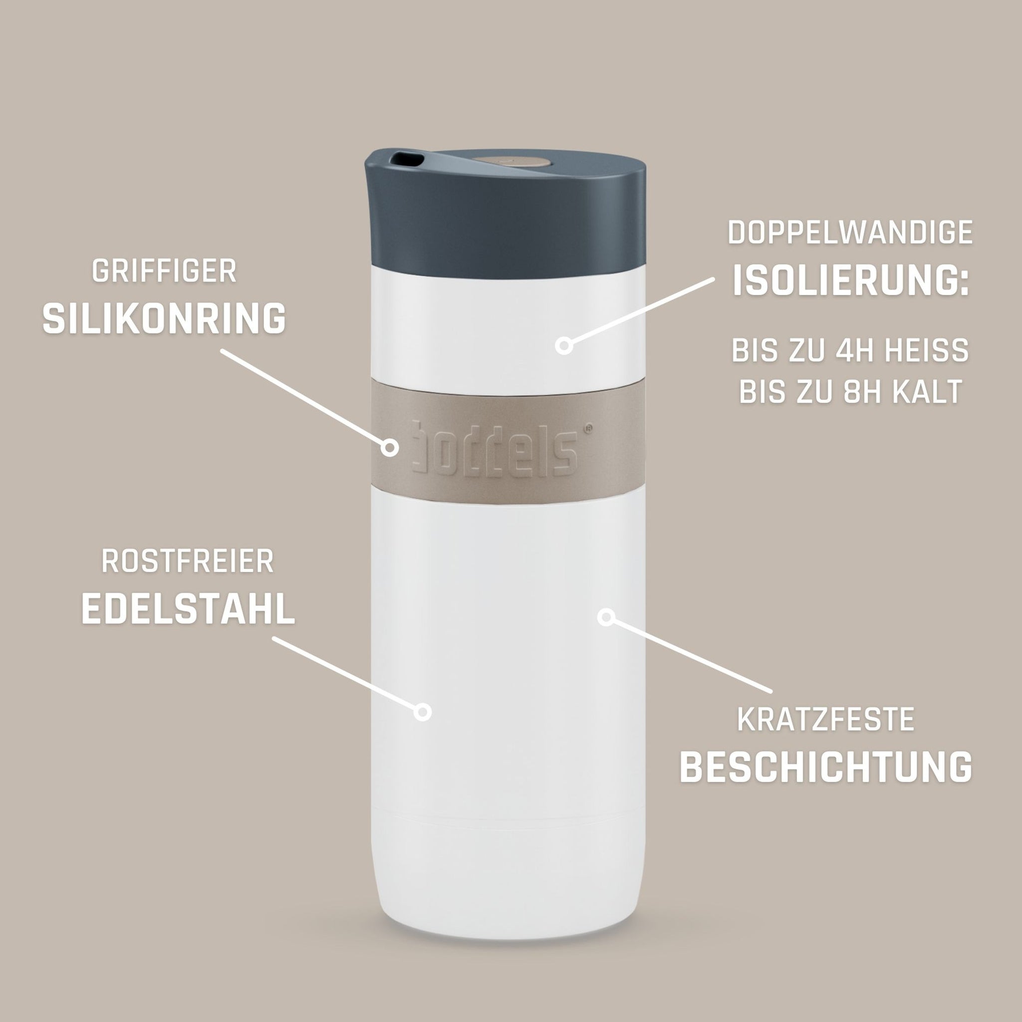 Praktisch und edel - für zuhause, im Büro oder unterwegs: der BODDELS Thermobecher KOFFJE. Kein Morgen ohne Kaffee? Oder doch lieber ein frisch aufgebrühter Tee? Egal woher du dir deine tägliche Energie holst, mit dem BODDELS Thermobecher KOFFJE bleiben deine Getränke länger heiß und sind ebenso schick wie nachhaltig verpackt. Und wer es lieber etwas kühler mag: Der Thermobecher Koffje hält Flüssigkeiten nicht nur zuverlässig warm, sondern auch kalt. Der BODDELS Thermobecher KOFFJE ist damit der optimale Begleiter für heiße und kalte Tage.