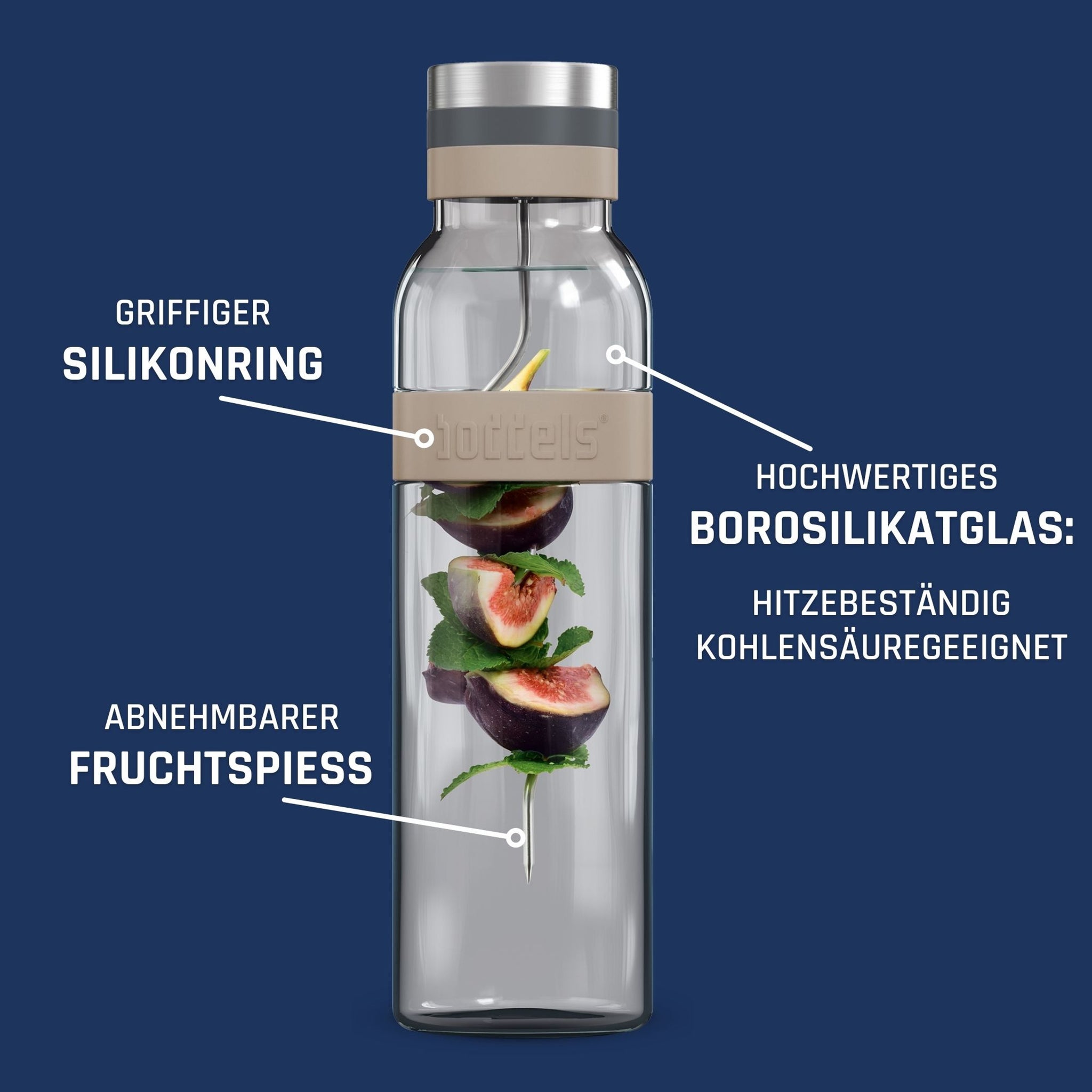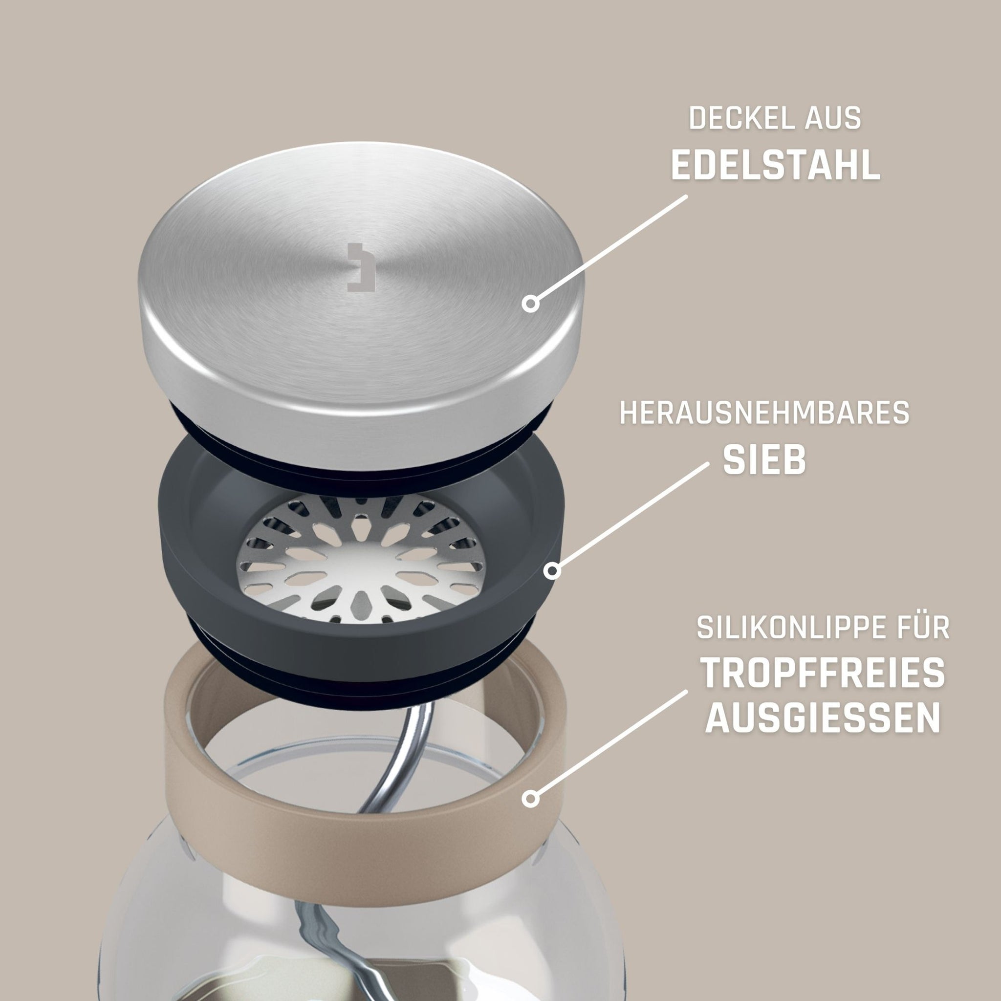 Der Verschluss der Karaffe ist KEIN Schraubverschluß sondern ist modular aufgebaut, sodass das Sieb, sowie der abschraubbare Fruchtspieß jederzeit entnommen werden können. Der Edelstahl-Deckel passt auch ohne Siebeinsatz auf die Glaskaraffe und ist für kohlensäurehaltige Getränke geeignet. Bei entnommenem Sieb ermöglicht der Silikonring ein Ausgießen ohne Tropfen.Ganz gleich, ob für stilles Wasser, frisches Fruchtwasser oder leckeren Eistee – mit der BODDELS Glaskaraffe SUND können Sie Getränke einfach und elegant ausschenken.