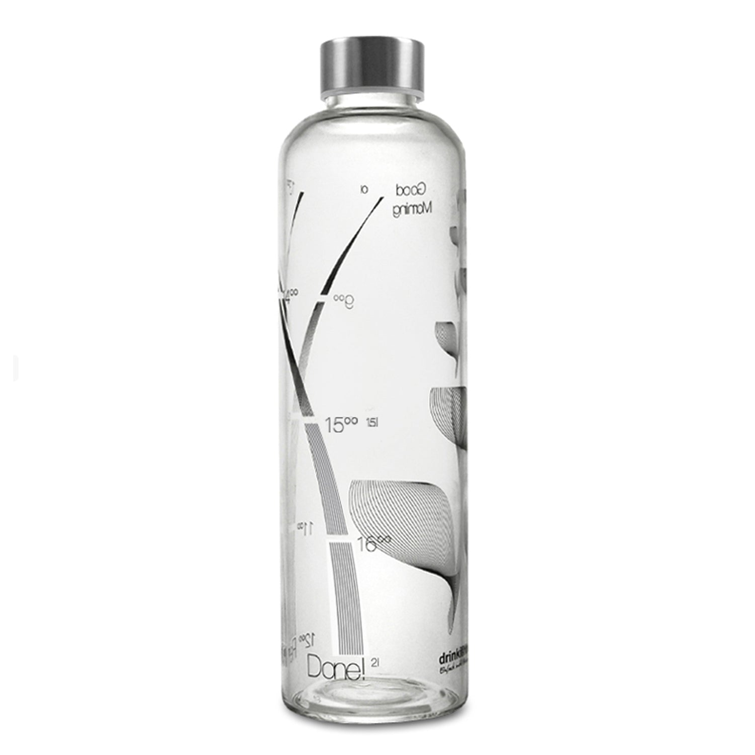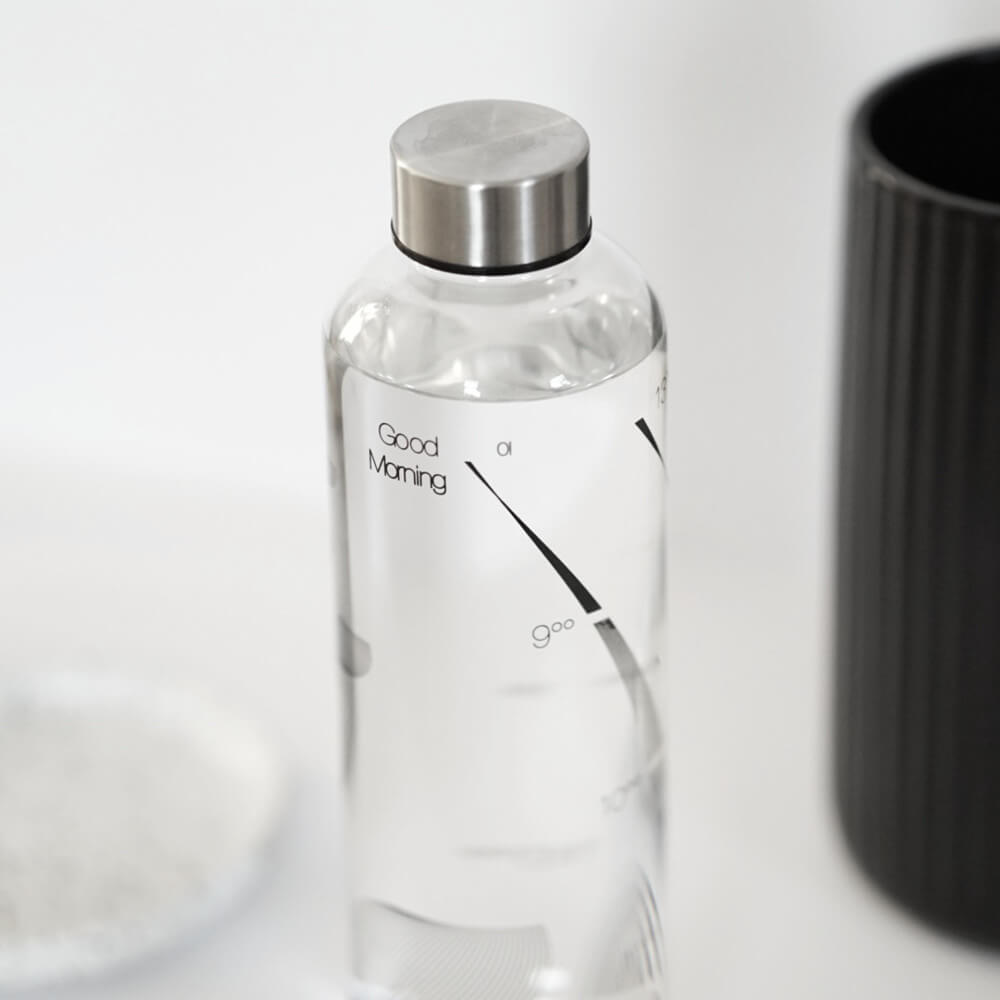 Animierende Wasserflasche mit Deckel aus Edelstahl. 1 Liter Füllmenge, Skala von 8.00 – 18.00 Uhr. Dekor schwarz.