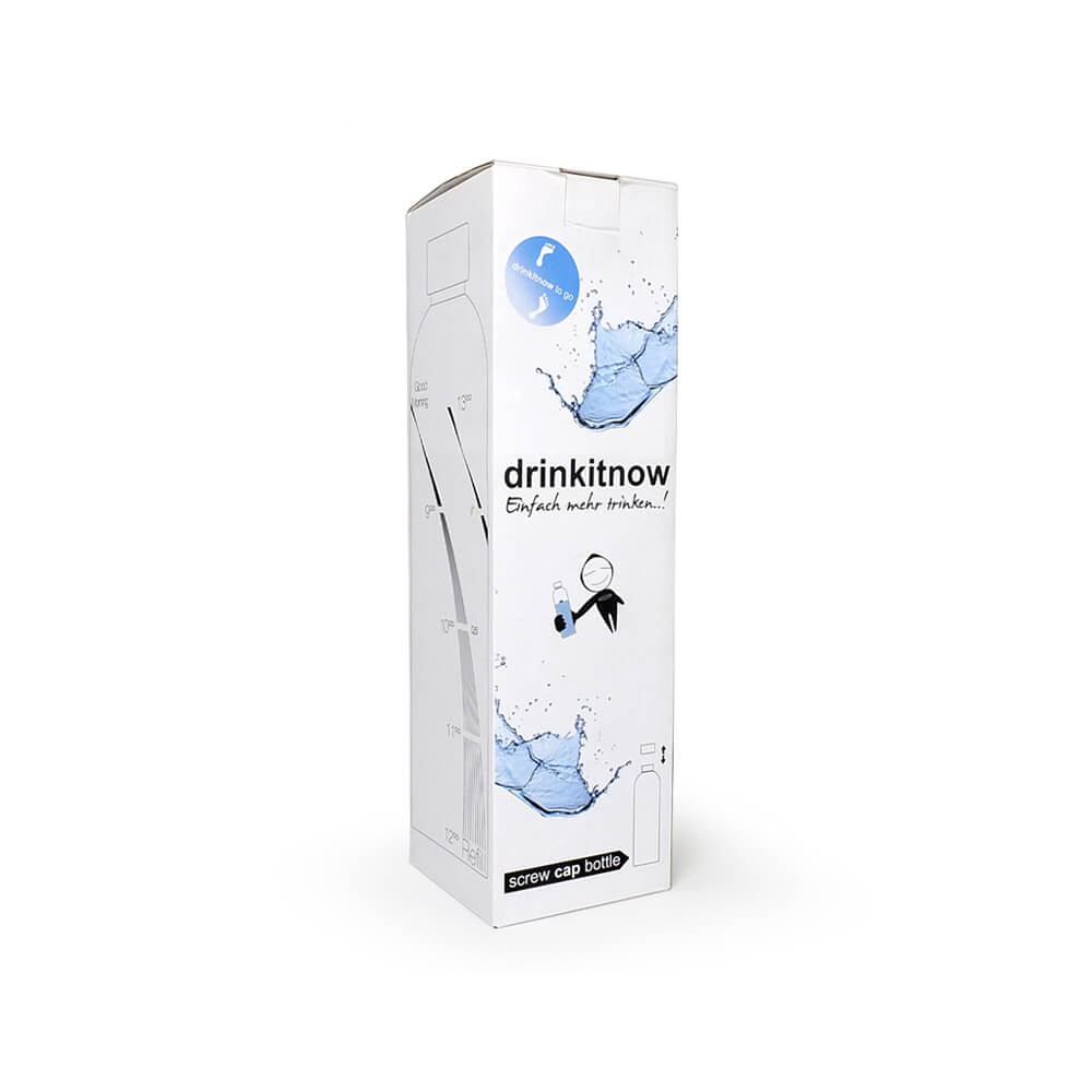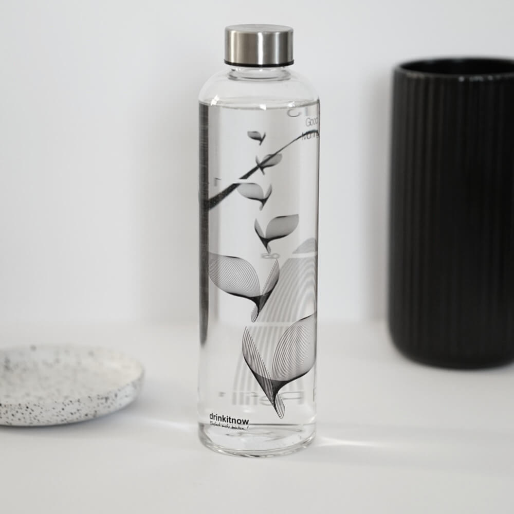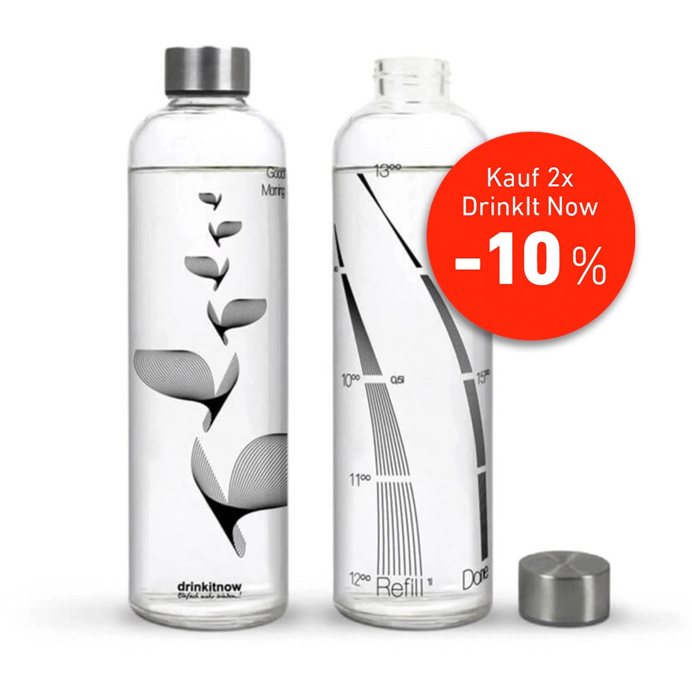 Die wiederverwendbare drinkitnow Flipper Glasflasche kannst du so oft nutzen, wie du willst. Statt aus Plastik, ist sie aus wiederverwendbarem Borosilikatglas, das weder Gerüche noch Geschmack annimmt, somit ist sie eine ideale Trinkflasche fürs Büro, unterwegs und auch für zu Hause, denn richtiges Trinken heißt vor allem, regelmäßig dabei zu bleiben. Fülle die 1 Liter Trinkflasche einfach morgens und um 12 Uhr mittags noch einmal auf. Am Ende des Tages sind so spielend leicht 2 Liter geschafft. Die clevere Trinkskala gibt dir kleine Trinketappen vor, die du Stunde für Stunde erreichst. Ein Abschnitt entspricht dabei etwa einem Glas Wasser. Das schaffst du ganz leicht. Anders als mit einem einfachen Trinkglas behältst du mit der drinkitnow Flasche zu jeder Zeit den Überblick über dein Trinkpensum und siehst genau, was du schon geschafft hast.