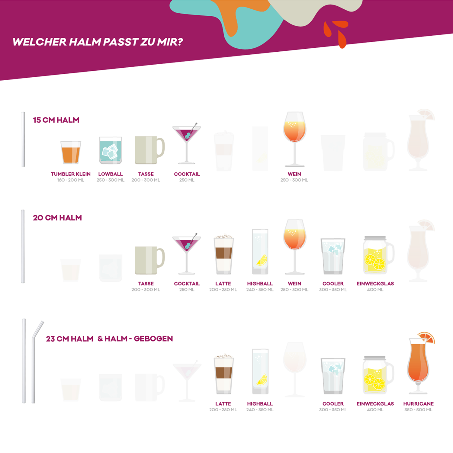 Unser 23 cm HALM Glasstrohhalm mit Knick ist perfekt für alle, die gerne Getränke in Gönnergröße genießen. Die leichte Biegung macht dein Trinkerlebnis noch angenehmer. So sind deine Lieblingsgetränke aus großem Becher, Einweck- oder Henkelglas schneller weg als du gucken kannst.