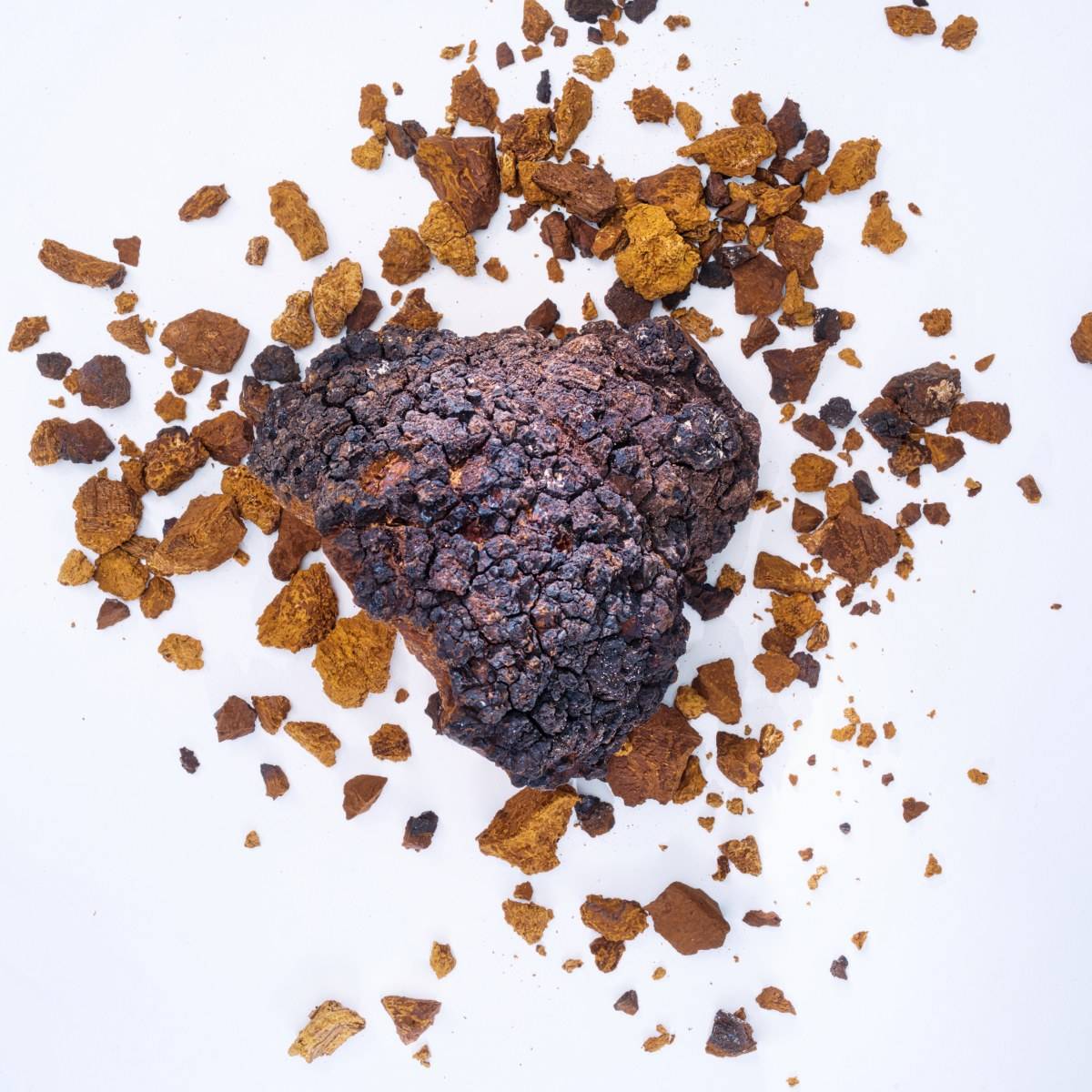 Chaga (Inonotus obliquus) kommt in den nördlichen Regionen Europas und Asiens vor und wird dort seit Jahrhunderten traditionell verwendet. Der Pilz wächst hauptsächlich auf Birken und hat ein charakteristisches rissiges, geschwärztes Aussehen mit einem rot-orangefarbenen Kern.
