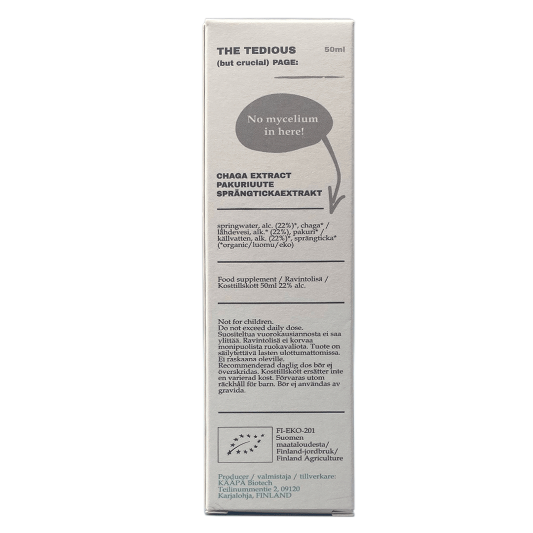 KÄÄPÄ Chaga Tinktur ist ein hochreines Chaga-Dual-Extrakt mit einer Konzentration von 400 mg Chaga-Extrakt pro 2 ml Tinktur.