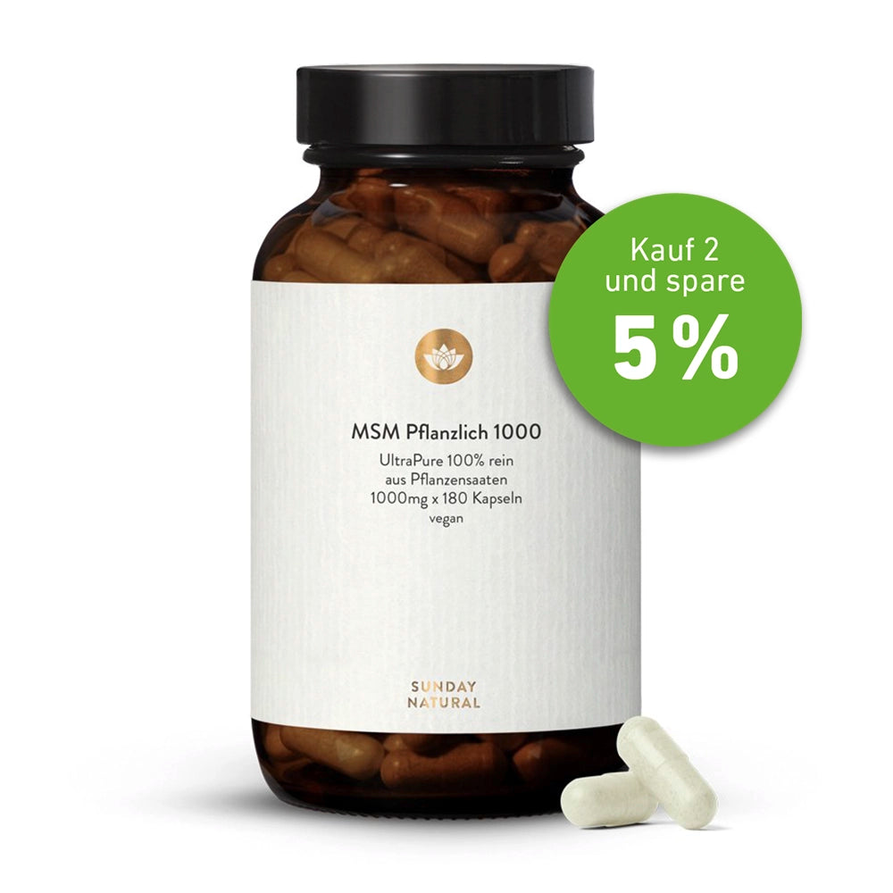 Pflanzliches MSM (Methylsulfonylmethan) aus Ölen verschiedener Pflanzensaaten. Pro Kapsel 1000mg MSM, vegan, ohne Zusätze. 180 Kapseln