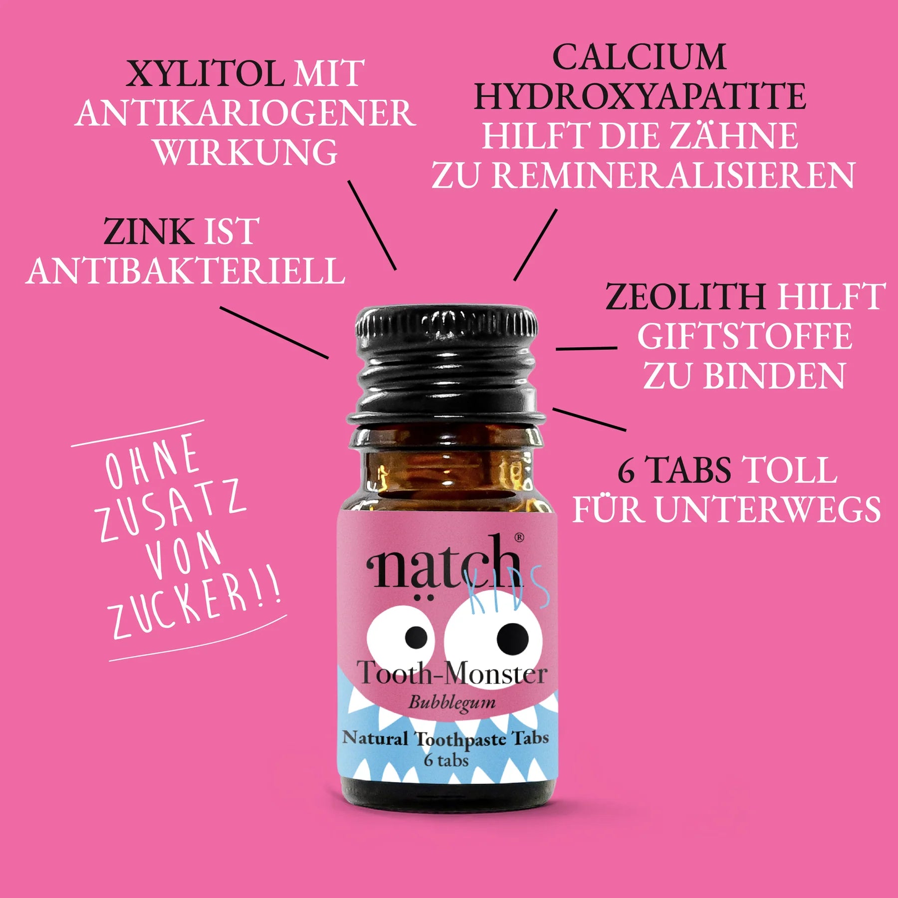 Zusätzlich sind die Natch Tooth Monster Tabs mit Zeolith verstärkt, das bekannt dafür ist, den Säuregehalt im Mund zu neutralisieren und zu entgiften. Und Zink sorgt mit seinen antibakteriellen und Anti-Plaque-Eigenschaften für rundum gesunde Zähne. Und das Beste: Die Natch Kids Bubblegum Zahnpasta Tabs bestehen aus natürlichen, lebensmittelechten Zutaten, ganz ohne künstliche Zucker. Der leckere Geschmack entsteht durch eine einzigartige Mischung aus verschiedenen Ölen sowie Gemüse- und Fruchtextrakten. Perfekt für alle, die den unvergleichlichen Geschmack von Kaugummi lieben – egal, ob jung oder alt!