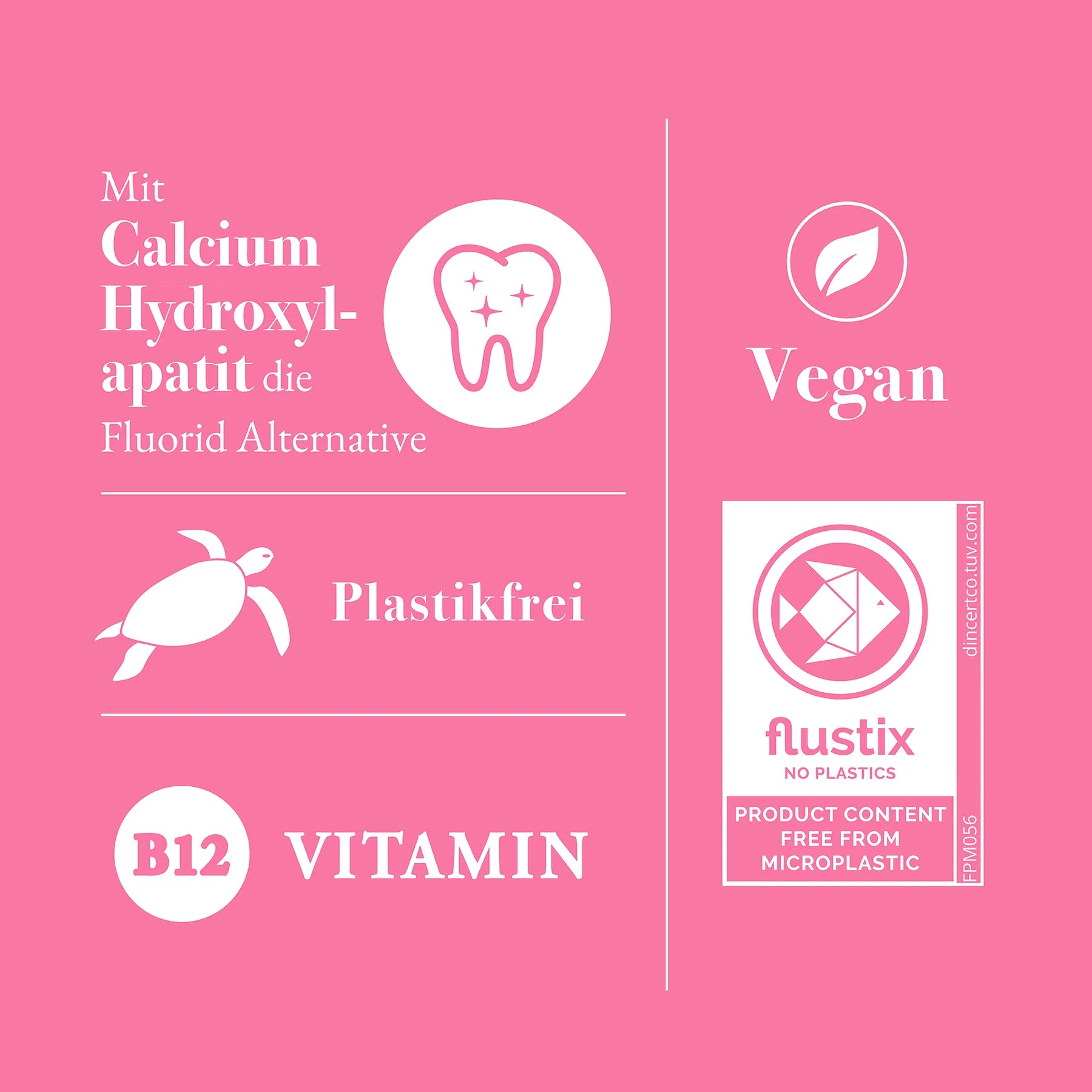 Fluorid Alternative: Als Alternative zu herkömmlichen Fluorid verwenden wir Calcium-Hydroxylapatit (HAp). Dieser Wirkstoff wird aus einer natürlichen Form von Calciumphosphat hergestellt. Es ist das Hauptmineral, aus dem unsere Zähne und Knochen bestehen (ca. 95% des Zahnschmelzes & 70% des Dentins). Studien zeigen, dass HAp eine wirksame Alternative zu Fluorid ist, die gleichermaßen zur Remineralisierung der Zähne beitragen und das Risiko von Karies und Zahnerosion verringern kann. HAp ist biokompatibel und unbedenklich, selbst wenn es verschluckt wird.