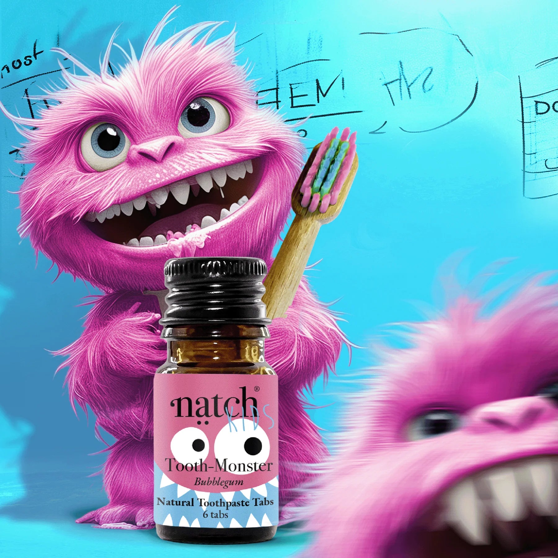 Entdecke die brandneuen Natch Tooth Monster Tabs und mache das Zähneputzen zu einem Abenteuer! Natch Tabs sind ohne Fluorid und stattdessen mit Calcium-Hydroxylapatit (HAP) angereichert, das zum Schutz und zur Remineralisierung der Zähne beiträgt, indem es kleine Risse im Zahnschmelz repariert. HAP ist biokompatibel und unbedenklich, selbst wenn es verschluckt wird.