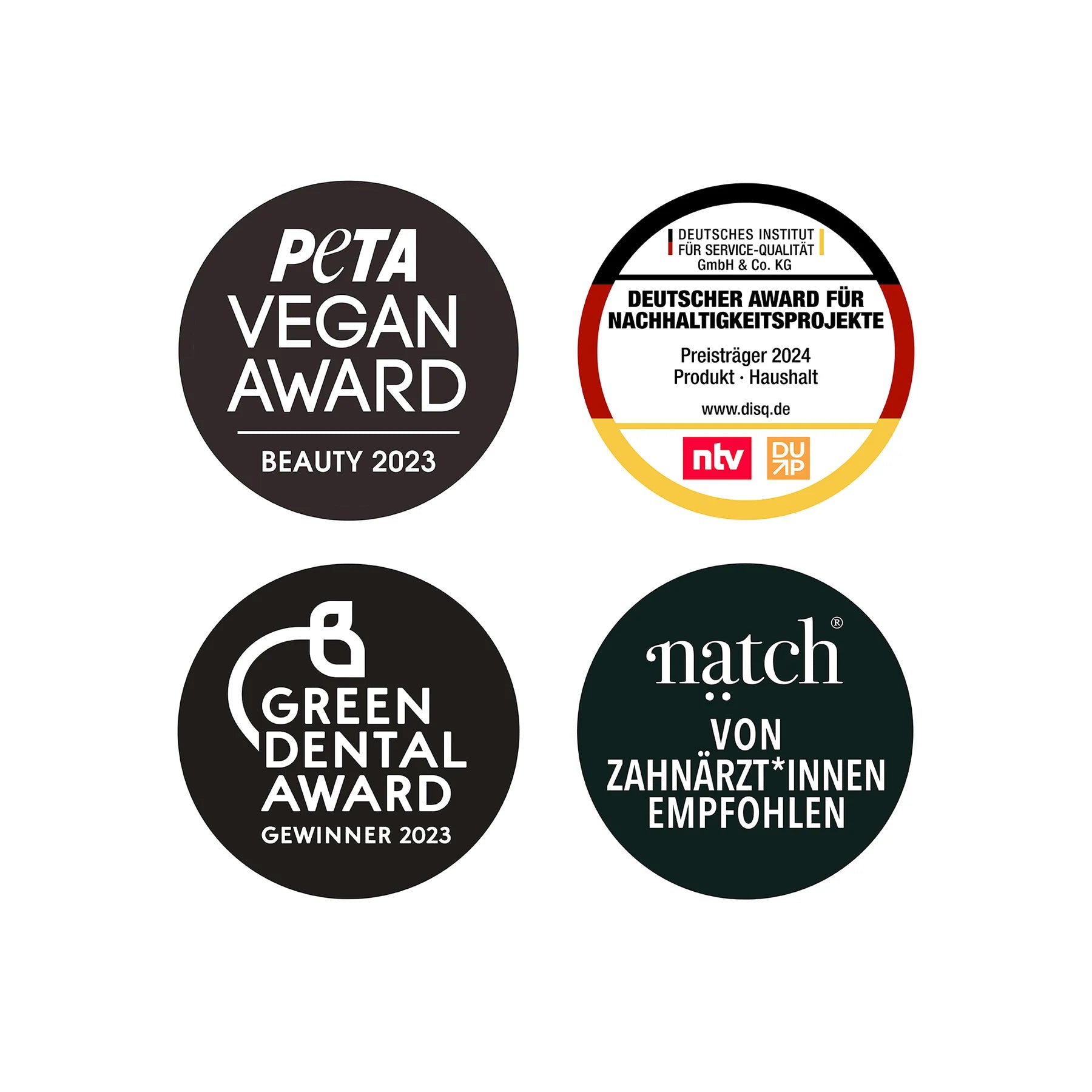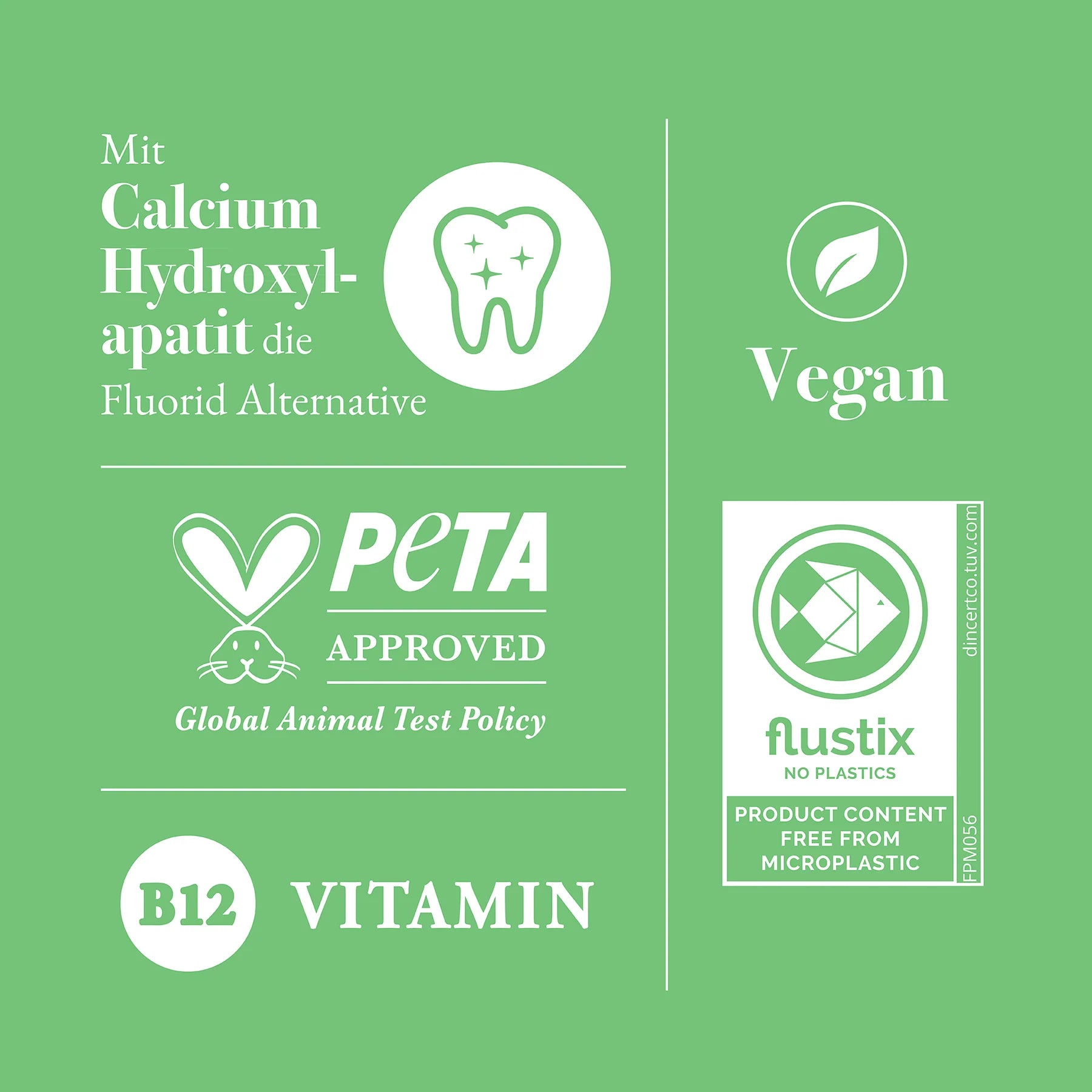 Fluorid Alternative: Als Alternative zu herkömmlichen Fluorid verwenden wir Calcium-Hydroxylapatit (HAp). Dieser Wirkstoff wird aus einer natürlichen Form von Calciumphosphat hergestellt. Es ist das Hauptmineral, aus dem unsere Zähne und Knochen bestehen (ca. 95% des Zahnschmelzes & 70% des Dentins). Studien zeigen, dass HAp eine wirksame Alternative zu Fluorid ist, die gleichermaßen zur Remineralisierung der Zähne beitragen und das Risiko von Karies und Zahnerosion verringern kann. HAp ist biokompatibel und unbedenklich, selbst wenn es verschluckt wird.