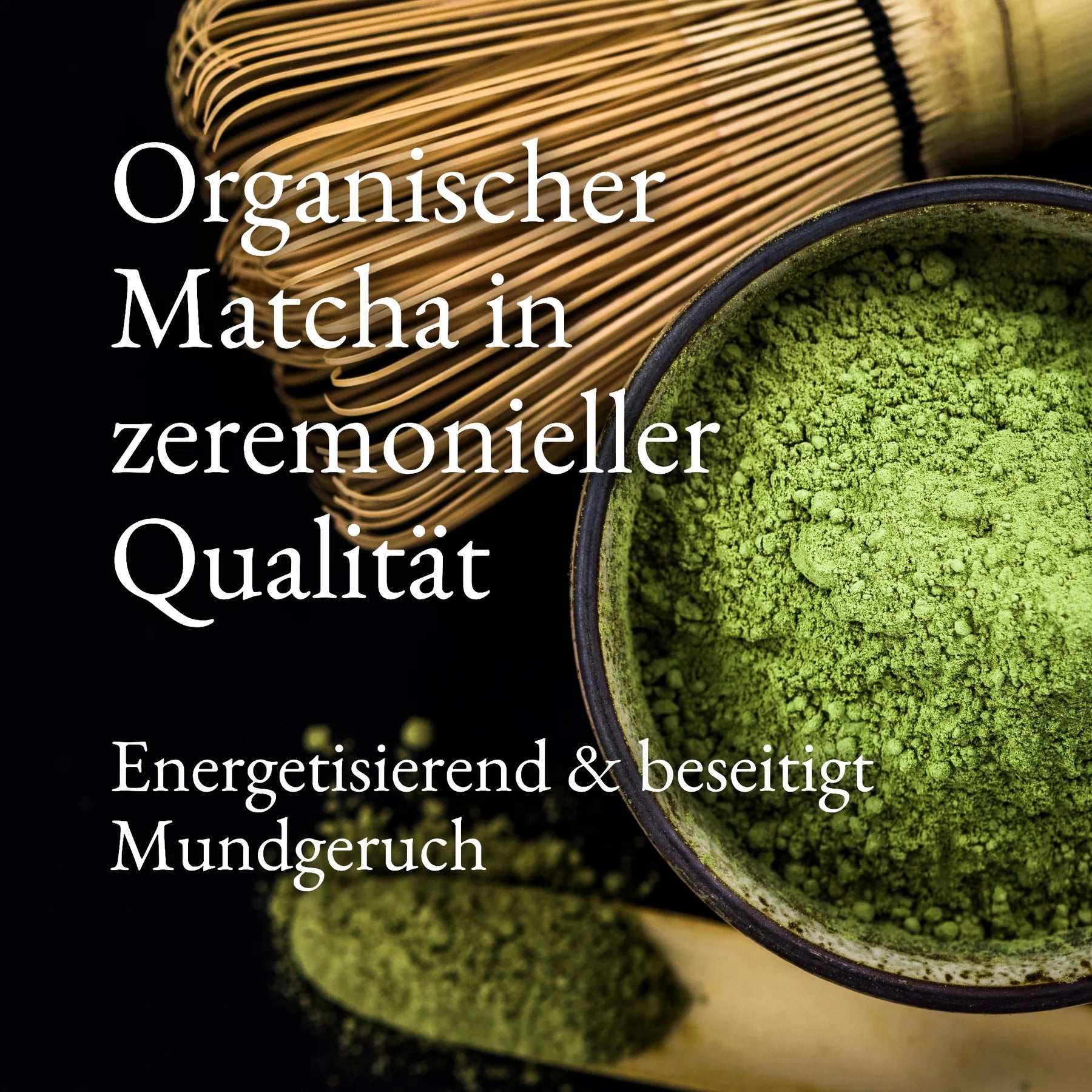 Ceremonial Matcha ist der hochwertigste Matcha, den es gibt. Es ist ein leuchtendes, grünes, samtiges Pulver, das aus ganzen grünen Teeblättern hergestellt wird, die kurz vor der Ernte beschattet werden, um den Koffein- und Chlorophyllgehalt zu erhöhen. Matcha liefert anhaltende Energie, unterstützt das Immunsystem, verbessert die Stimmung und die geistige Konzentration. Er ist auch gut für die Zähne und die allgemeine Mundgesundheit und enthält Flavonoide, die Entzündungen reduzieren, gesundes Zahnfleisch erhalten und das Wachstum von Bakterien im Mund begrenzen, die zu Karies und Mundgeruch beitragen.