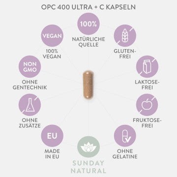 Jede Kapsel enthält zusätzlich 50 mg Vitamin C, das auch natürlicherweise in Pinienrinde, Weintrauben und anderen Lebensmittel im Naturverbund mit oligomeren Proanthocyanidinen vorliegt. OPC ist schwer bioverfügbar, so dass die Kombination mit Vitamin C sehr hilfreich sein kann.