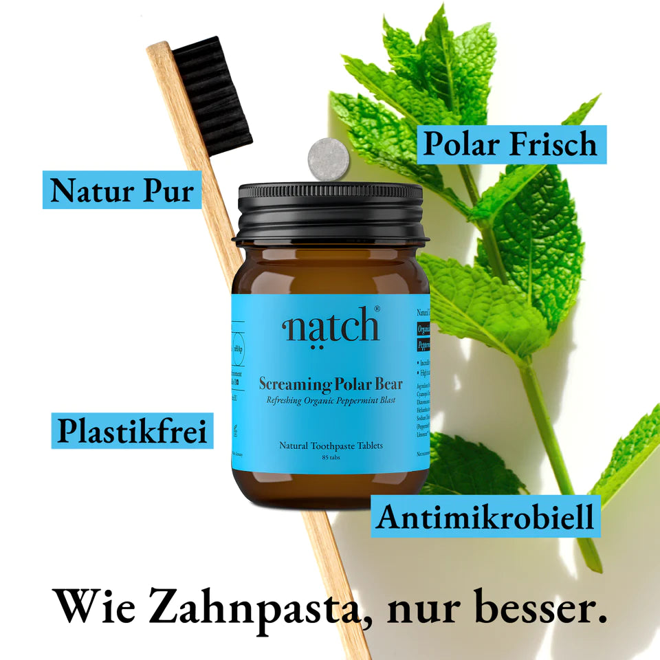 Eine unglaublich erfrischende Mischung aus biologisch angebauter Pfefferminze. Reich an natürlichen Pflanzenölen und deren antimikrobiellen Eigenschaften. Es hinterlässt eine arktische Frische und ein glattes Gefühl auf den Zähnen, wie direkt nach einem Besuch bei der Prophylaxe.