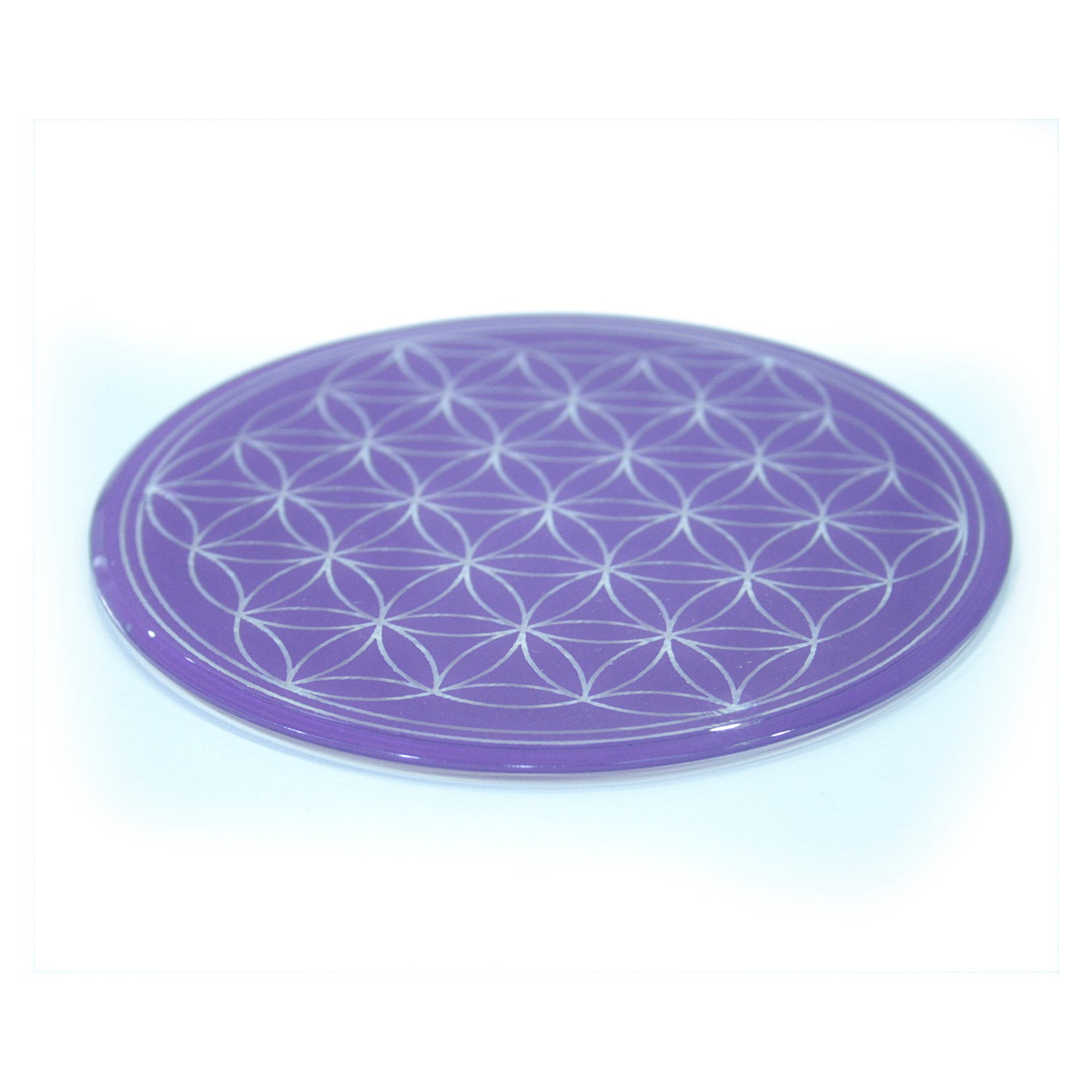 Getränkeuntersetzer aus Kristallglas, mit Lebensblume-Druck in violett.