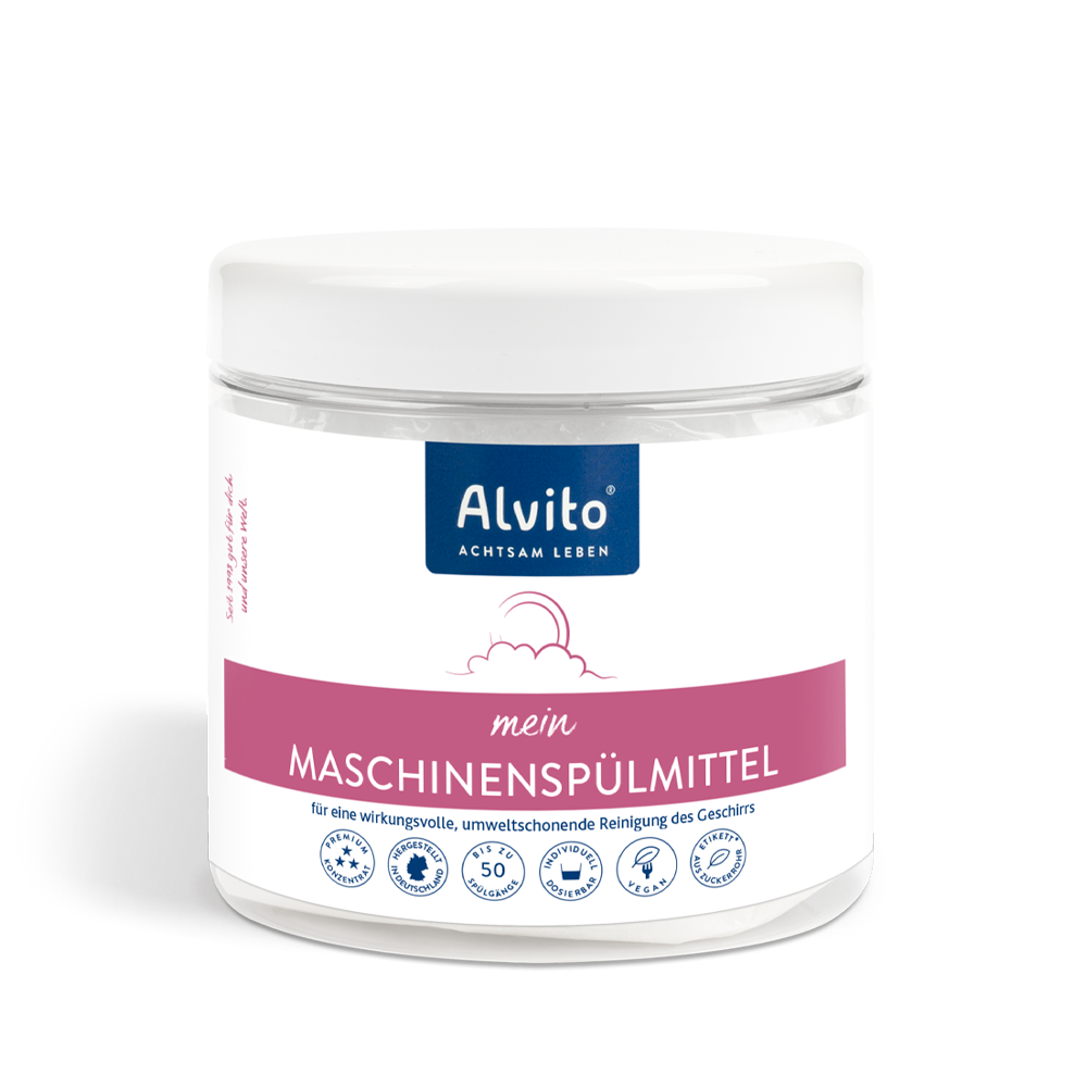 Das Maschinenspülmittel von Alvito hat eine hervorragende Spülkraft und lässt sich ohne Rückstände vom Geschirr spülen. Es kann aufgrund seiner hochwertigen Rezeptur individuell und sparsam dosiert werden. Das ökologische Spülmaschinenpulver ist frei von Phosphaten, Seifen, synthetischen Duftstoffen, Silberschutz und Inhaltsstoffen auf petrochemischer Basis.