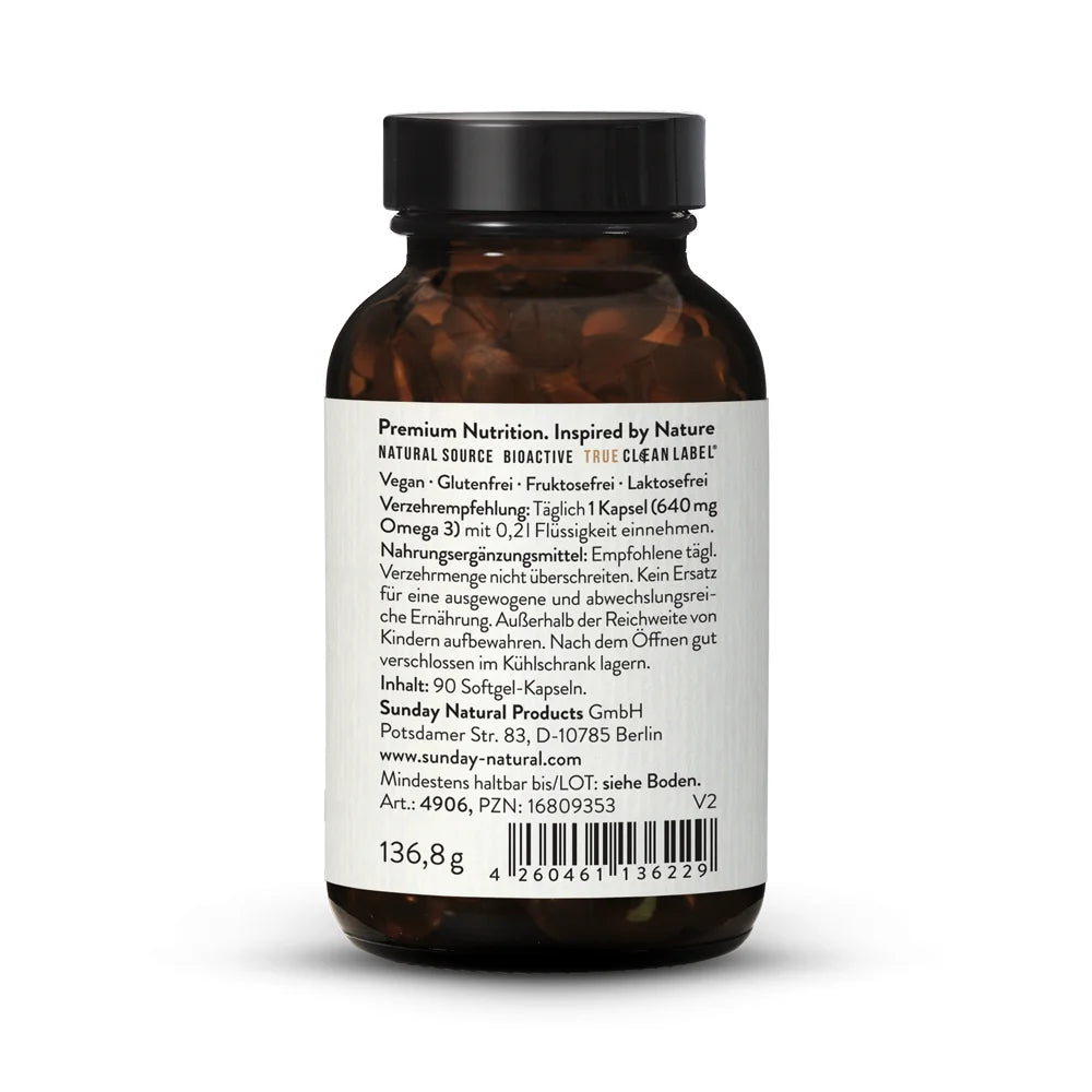 DHA und EPA als natürliches Algenöl der Mikroalge Schizochytrium sp. Bioaktiver Wirkkomplex, hochdosiert mit 640mg Omega-3-Fettsäuren, davon 400mg DHA und 200mg EPA pro Kapsel, jeweils in natürlicher Triglyceridform. Plus Vorstufe ALA aus Leinöl. Eingebettet in Fettsäuren- und Pflanzenstoff-Komplex natürlicher Öle aus Chia, Moringa, Borretsch und Sanddorn. Spezialanfertigung mit hochwertigen Softgel-Kapseln aus Tapioka-Stärke. 90 Softgelkapseln