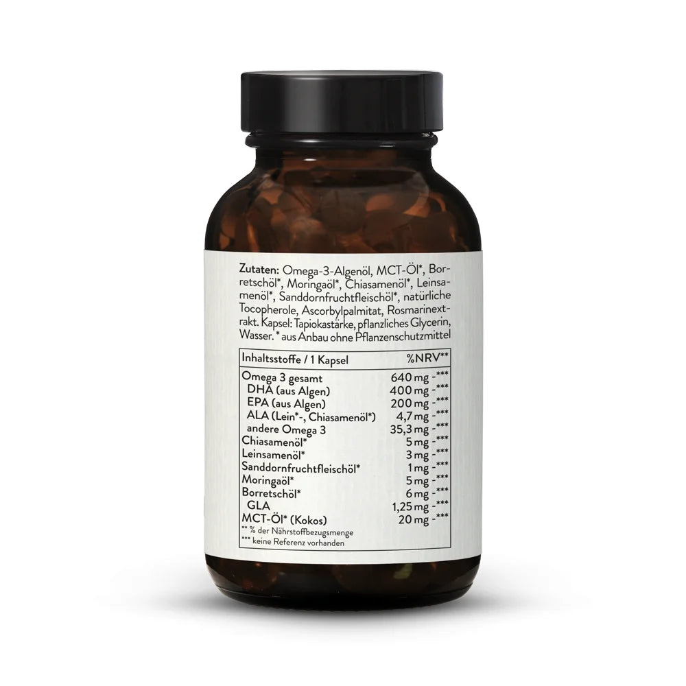 Den Kern des Komplexes bildet eine hochdosierte und 100% vegane Mischung der bioaktiven Omega-3-Fettsäuren DHA und EPA aus Algen. Um vergleichbare Konzentrationen zu erreichen, verwenden herkömmliche Omega-3-Supplemente meist Fischöl als Basis. Viele Fischarten weisen jedoch hohe Belastungen mit Schwermetallen auf, und auch aus ethischer und ökologischer Sicht ist Fischöl extrem fragwürdig.