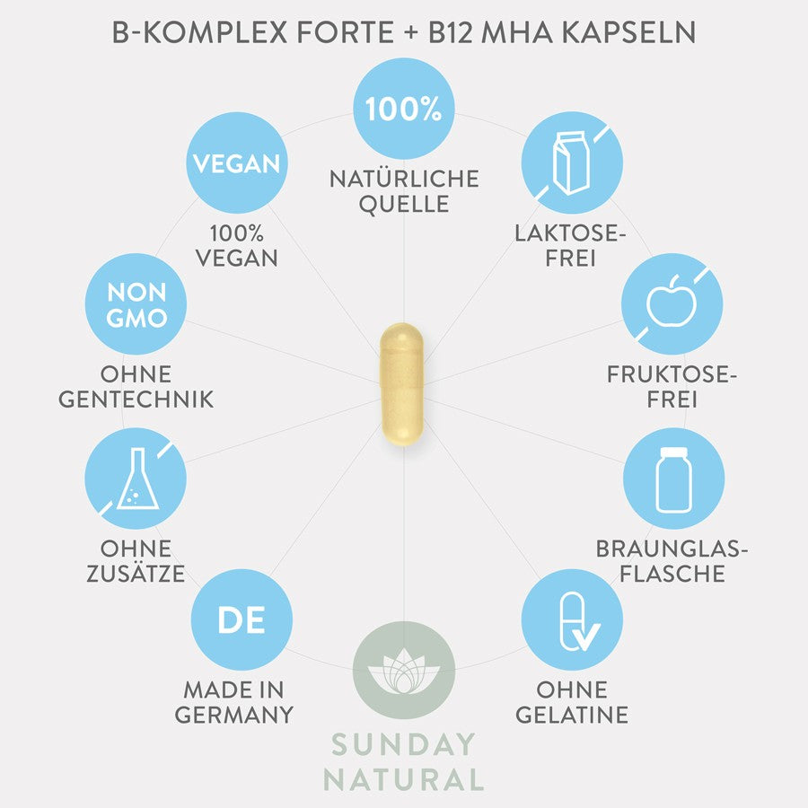Höchstdosierter bioaktiver B-Komplex mit allen acht B-Vitaminen und fünf Kofaktoren für den erhöhten Bedarf. Mit 1000µg bioaktivem Vitamin B12 bestehend aus allen drei natürlichen Cobalaminen (MH3A®-Formel). Ausschließlich bioverfügbare, reine Premium-Vitamine ergänzt durch die Kofaktoren Citicolin, Inositol, Betain, PABA und NADH. Vegan, laborgeprüft, ohne Zusätze, 60 Kapseln.