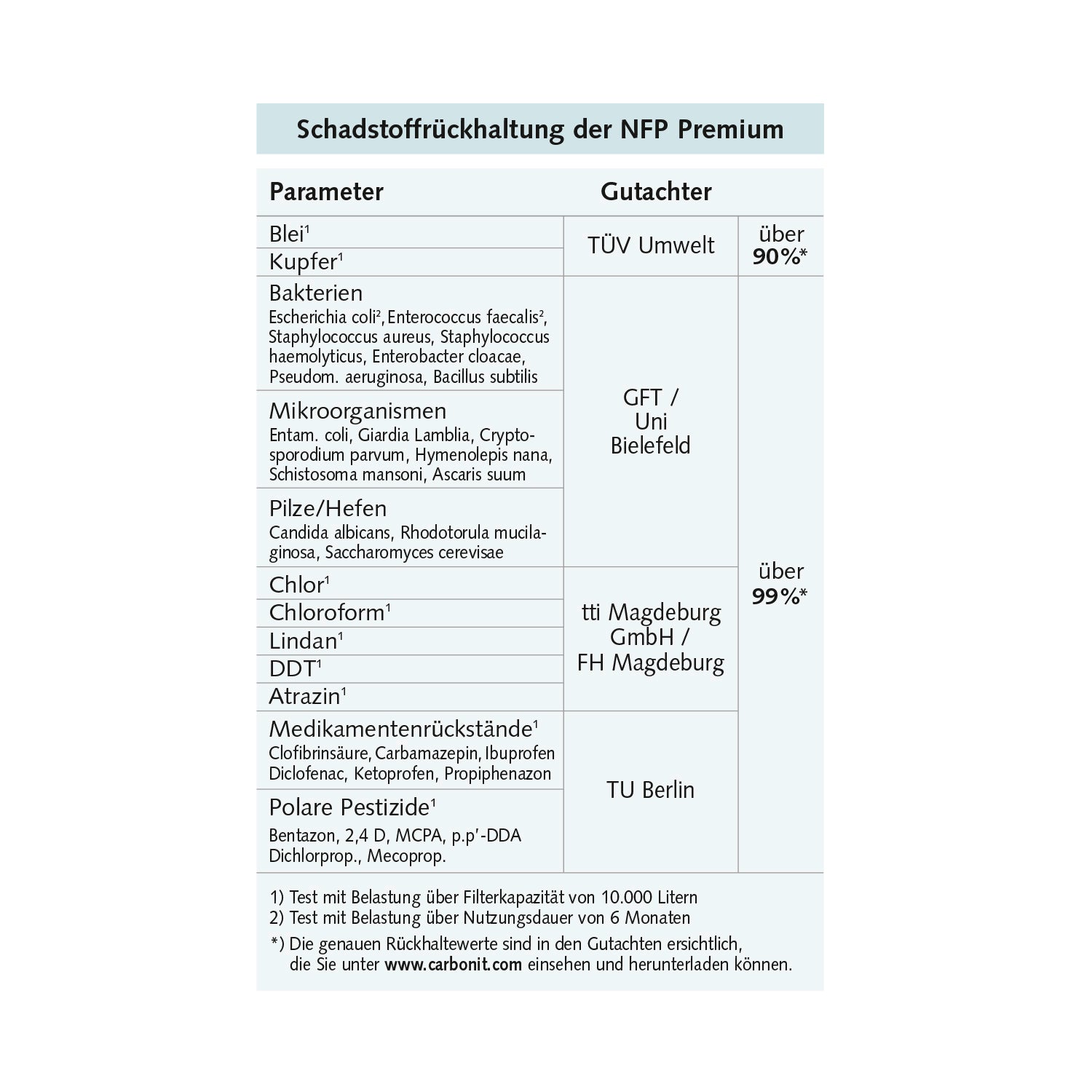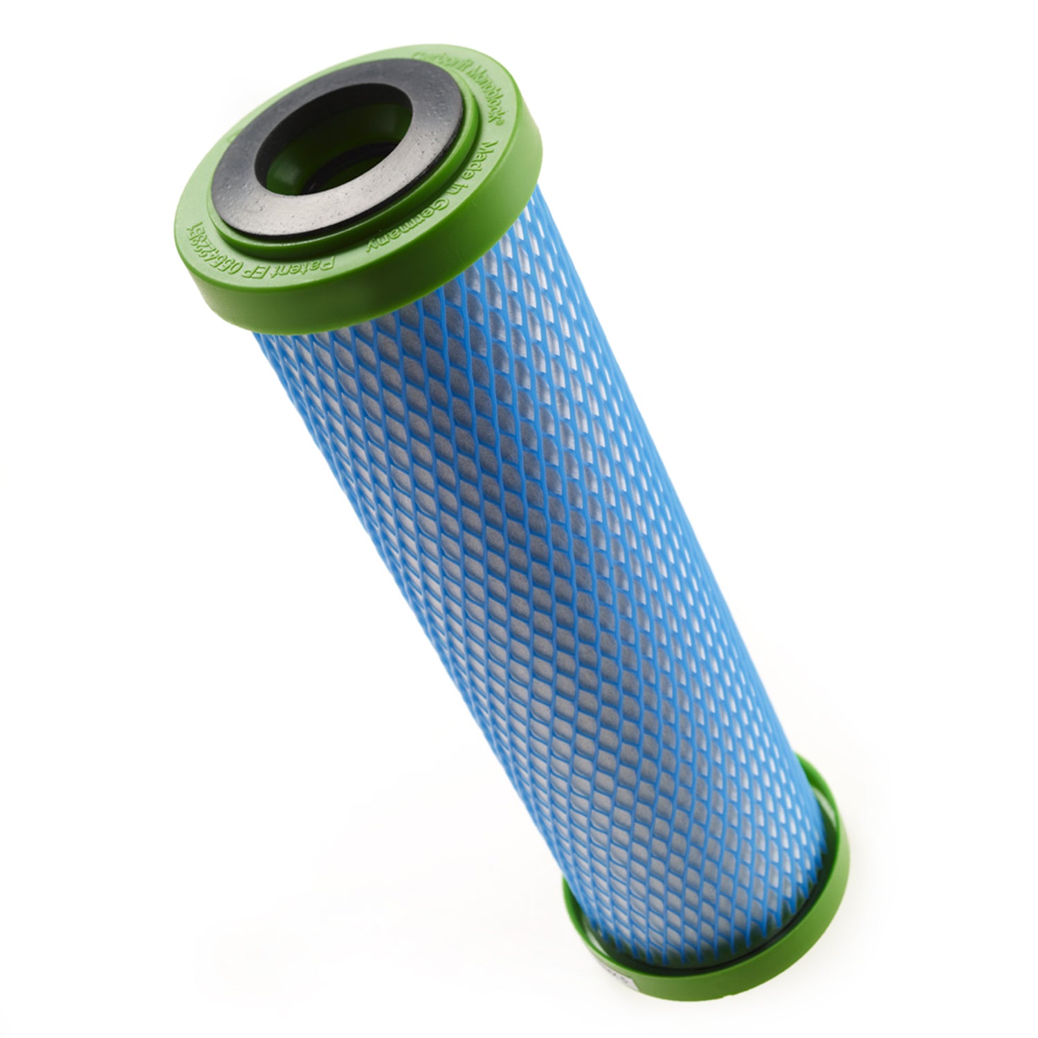 Carbonit® Monoblock: ein gebackener Blockfilter, mehrfach ausgezeichnet und wissenschaftlich anerkannt: Verbindet die bekannten adsorptiven Kräfte der gesinterten Aktivkohle (z.B. Pestizide) mit mechanischer Filtration (z.B. Bakterien). (Nicht zu verwechseln mit losen Schüttungen aus Granulatkohle oder extrudierten Blöcken).