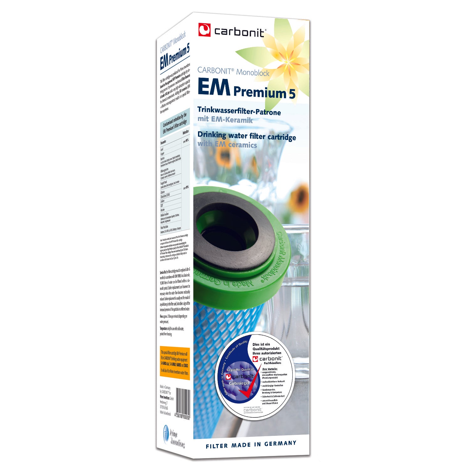 Die EM Premium 5 ist eine von CARBONIT produziert bewährte Aktivkohle-Blockfilterpatrone in Premium-Feinheit von 0,45 µm, die zur Belebung des gefilterten Wassers zusätzlich mit 5% Granulat aus Effektiven Mikroorganismen (EM) versetzt wird. Das Granulat wird mit gesintert, so dass keinerlei hygienische Beeinträchtigung erfolgt. Anwender berichten von spürbar besserem Geschmack und einer geringeren Oberflächenspannung.