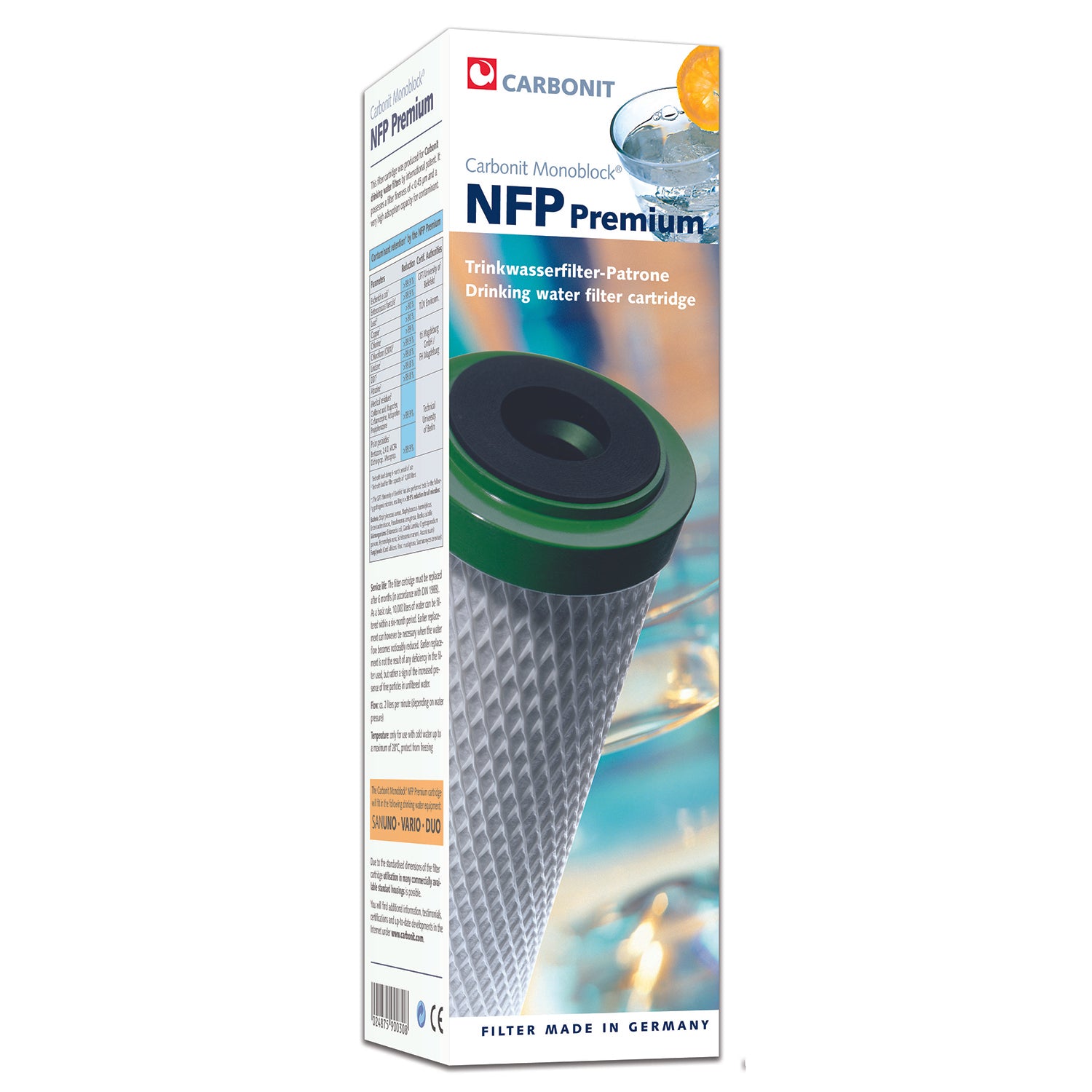Die NFP Premium-D ist eine gesinterte Aktivkohleblockfilter-Patrone zur Trinkwasserfilterung mit einem Durchfluss ca. 3 Liter pro Minute (abhängig vom Wasserdruck). Damit hat sie einen etwas größeren Durchfluss als die Standardpatrone NFP Premium, für die alle Untersuchungen und Zertifikate erstellt wurden.