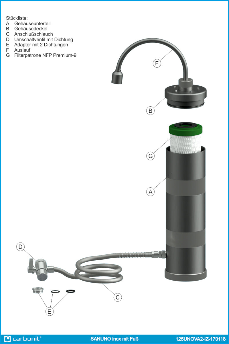 SANUNO inox F (mit Fuß) - dieser hochwertige Auftischfilter aus Edelstahl (V4A) bietet Ästhetik und 100% Carbonit®-Qualität. Einfach das Spezial-Umlenkventil an den Wasserhahn anschrauben - fertig.