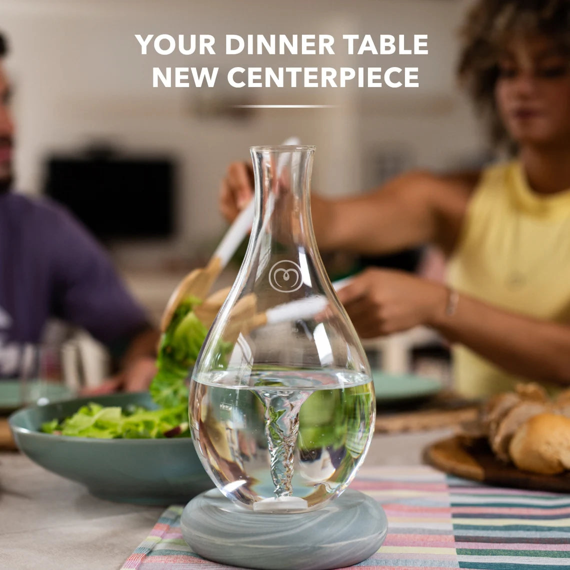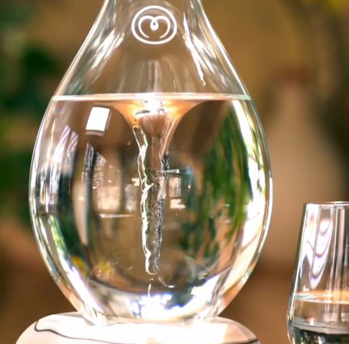 The hyperbolic water vortex is created by a magnetically driven swirler at the bottom of the carafe. The vortex aerates and restructures the water, introducing fresh oxygen and accelerating the evaporation of volatile compounds. This, in turn, affects dissolved oxygen and pH levels, restoring your water's natural sweet, silky mouthfeel and structural balance.