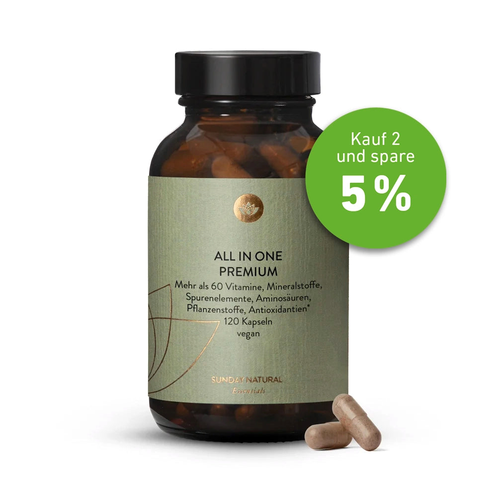 The All in One Premium Multi-Nutrient Complex provides a basic supplement with all essential nutrients in just one preparation. A uniquely broad spectrum of nutrients and plant compounds. A rich matrix of algae, polyphenols, and natural superfood powders from greens, algae, and berries. Hand-selected from the finest individual active ingredients. No additives, therefore a natural algae flavor. 120 Capsules