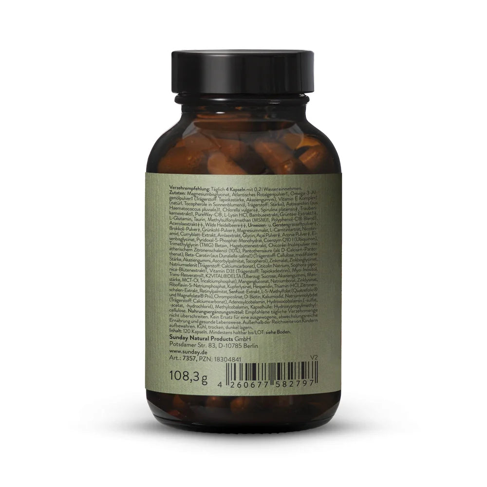 Amino acids, secondary plant substances and superfoods: With the vegan amino acids L-lysine, L-carnitine, taurine, L-glutamine, glycine, OPC from French premium grape seeds as a highly pure water extract, polyphenols and catechins from wild blueberry and fresh green tea extract, highly active resveratrol as Original Veri-te™ from fermentation, quercetin, rutin and astaxanthin as well as coenzyme Q10, high-quality chlorella and spirulina grown without pesticides and a wide range of high-quality supergreens such as broccoli, kale and barley and ancient wheatgrass juice, grown without pesticides, rounded off with the berries açai, aronia, acerola, amla and rosehip.