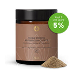 Premium-Noble-Strong-Mushroom-Coffee-Pulver. Einzigartig harmonisch-aromatische Komposition aus grünem Kaffee, Cashew & den wichtigsten 7 Vitalpilzen Hericium, Cordyceps, Reishi, Chaga, Auricularia, Tremella & Shiitake. 120mg Koffein pro Portion. Vegan, ohne Zuckerzusatz, ohne künstliche Süß-, Farb- und Aromastoffe.