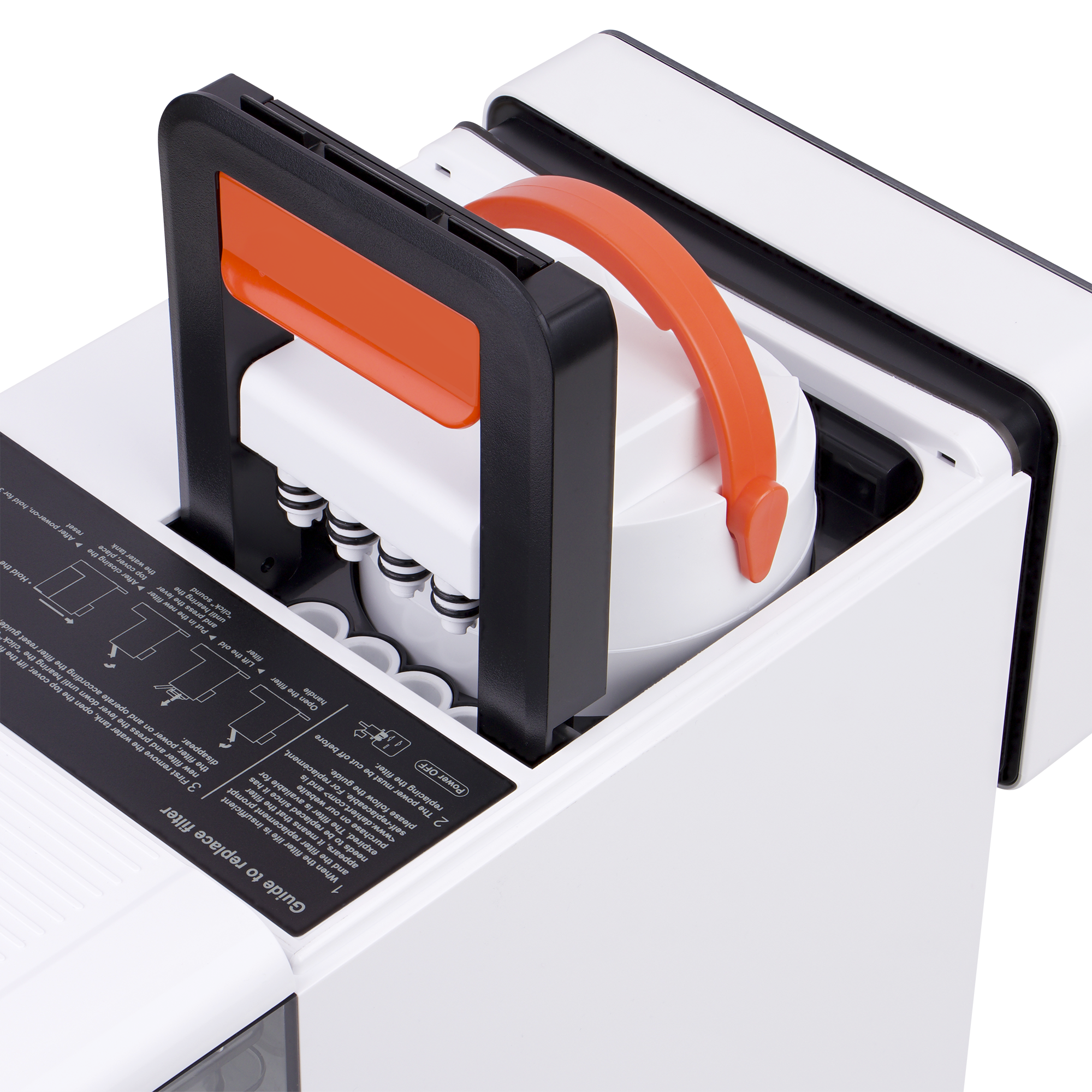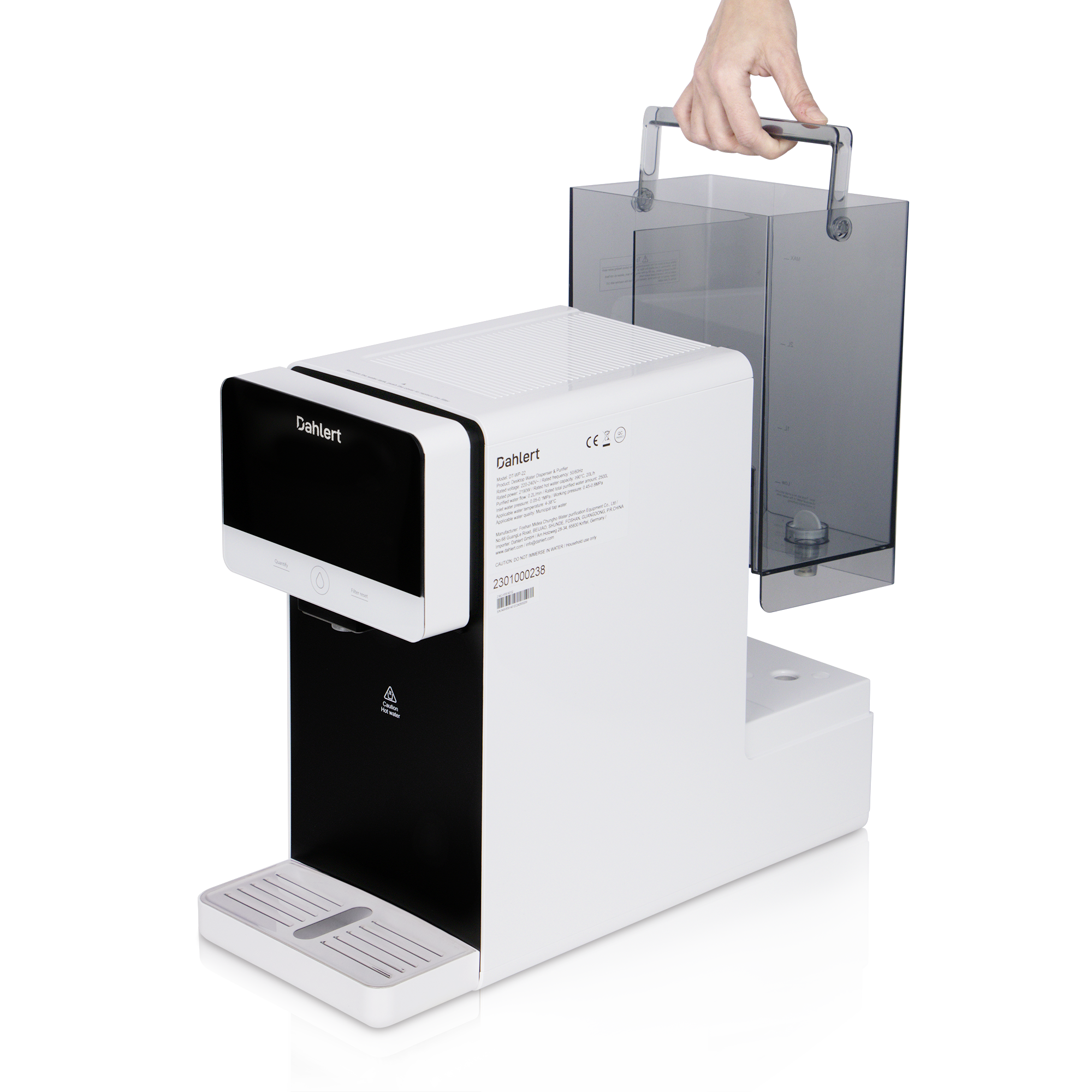 Das Gerät verfügt über eine automatische Membranspülung für eine längere Lebenszeit der Membran. Zwei Anzeigen geben darüberhinaus Zeichen für nötigen Filterwechsel und nötige Befüllung mit kaltem Leitungswasser. Durch die Kombination aller Filterstufen in nur einer Kartusche, die wiederum mit nur einem einzigen Handgriff zu entnehmen ist, ist der Filterwechsel ein Kinderspiel und in 1 Minute erledigt.