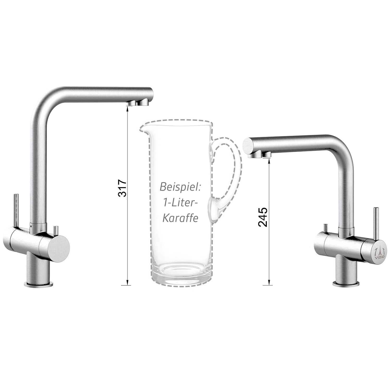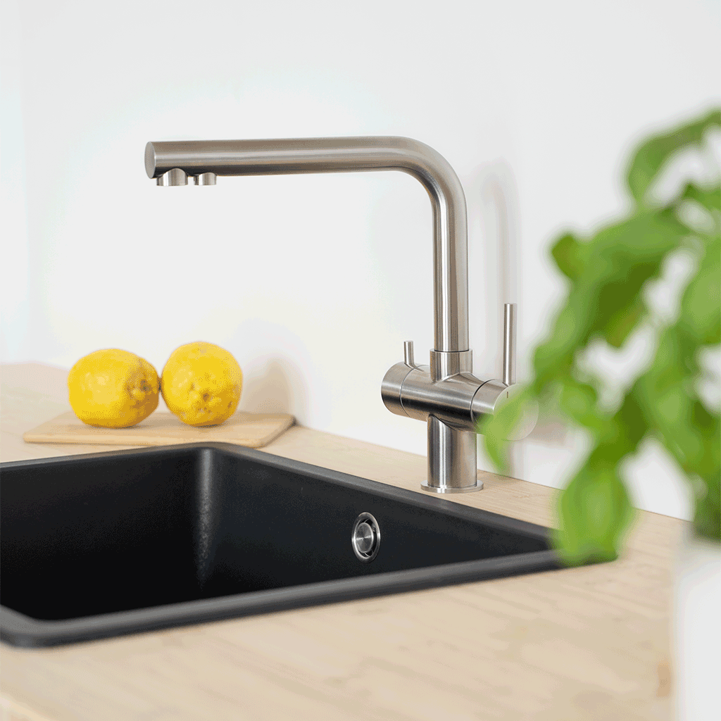 Dieser hochwertige 3 Wege Wasserhahn aus V4A Edelstahl ist die optimale Lösung, wenn Sie keinen zusätzlichen Wasserhahn für den Wasserfilter installieren möchten bzw. können. Diese Armatur misst nur 28cm in der Höhe und ist mit einem Nutzwasserauslauf (Kalt- und Warmwasser) und separatem Filterwasserauslauf ausgestattet. Der größere Mischhebel reguliert das ungefilterte Wasser warm und kalt und der kleinere Regler die Entnahme des gefilterten Trinkwassers, bei Bedarf kann der 4. Weg geöffnet und das System mit einer Sprudelanlage erweitert werden. Für alle Untertisch-Trinkwasserfilter aus unserem Sortiment geeignet.