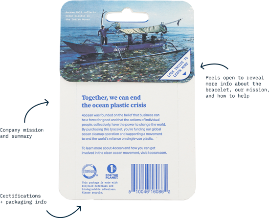 4ocean-Helferinnen und -Helfer sammeln den Plastik-Abfall am Strand auf oder fischen ihn mit Netzen aus dem Wasser. Sofern möglich, wird der Plastikabfall noch vor Ort recycelt. Der Rest wird zu Abfallentsorgungsanlagen gebracht. 4ocean ist inzwischen in 16 Ländern aktiv und beschäftigt 150 Mitarbeiter, darunter Freiwillige aber auch viele Fischer. Daneben hat die Organisation ein eigenes Bildungsprogramm aufgesetzt, das mehr Bewusstsein für die Gefahren von Plastik im Meer schaffen soll. Mit jedem neuen Armband wird neben der Finanzierung der eigenen Arbeit außerdem ein fremdes Umwelt-Projekt unterstützt!