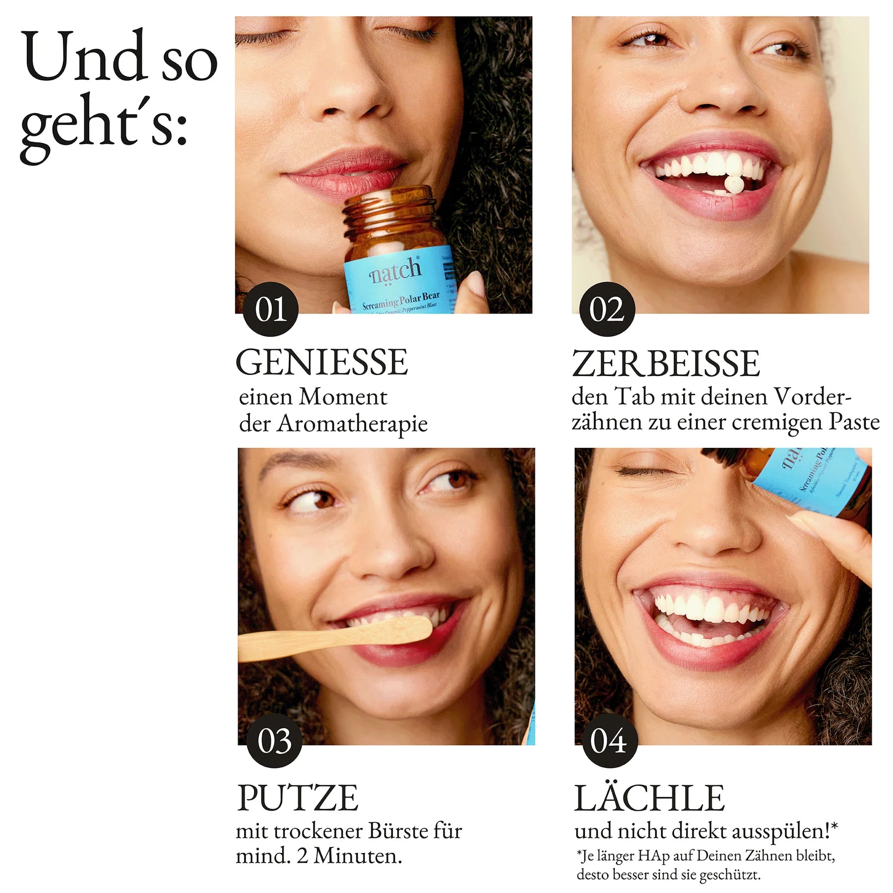 Ein Tab wird im Mund zerbissen zur Paste, die dann wie normale und herkömmliche Zahnpasta mit der Zahnbürste verteilt wird.