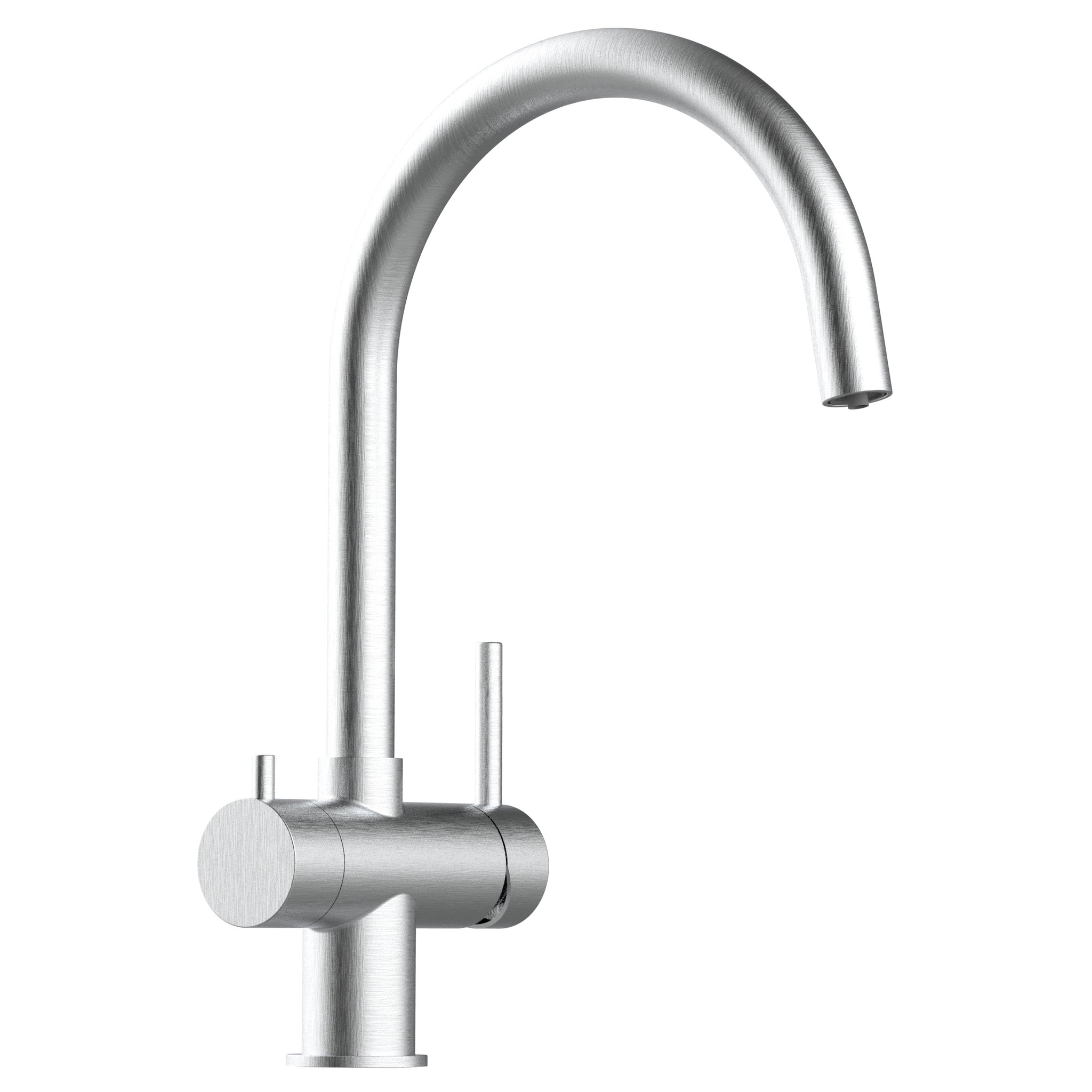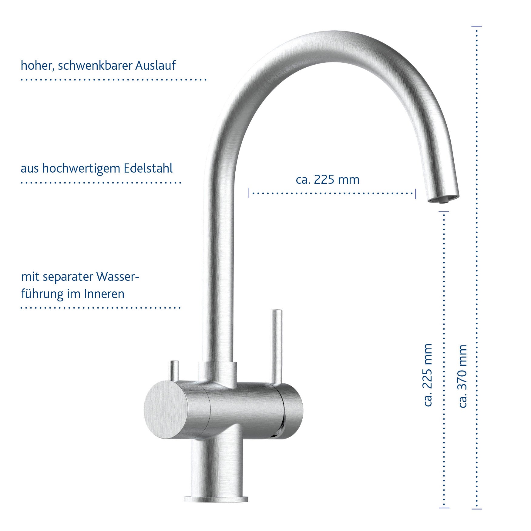 Dieser hochwertige 3 Wege Wasserhahn aus V4A Edelstahl ist die optimale Lösung, wenn Sie keinen zusätzlichen Wasserhahn für den Wasserfilter installieren möchten bzw. können. Die 3 Wege-Armatur ist mit einem Nutzwasserauslauf (Kalt- und Warmwasser) und separatem Filterwasserauslauf ausgestattet. Der größere Mischhebel reguliert das ungefilterte Wasser warm und kalt und der kleinere Regler die Entnahme des gefilterten Trinkwassers. Für alle Untertisch-Trinkwasserfilter aus unserem Sortiment geeignet.