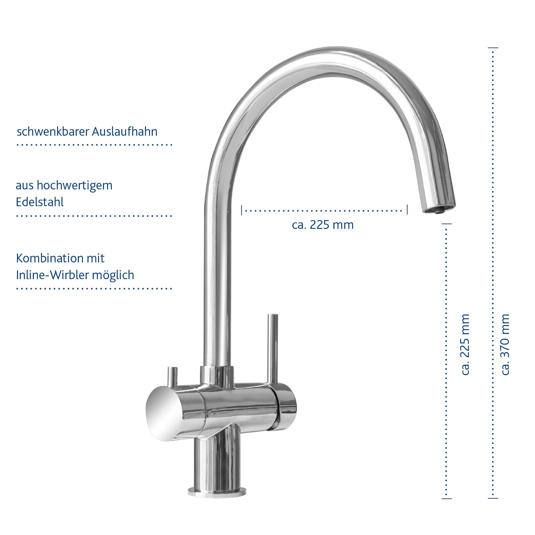 Dieser hochwertige 3 Wege Wasserhahn aus V4A Edelstahl ist die optimale Lösung, wenn Sie keinen zusätzlichen Wasserhahn für den Wasserfilter installieren möchten bzw. können. Die 3 Wege-Armatur ist mit einem Nutzwasserauslauf (Kalt- und Warmwasser) und separatem Filterwasserauslauf ausgestattet. Der größere Mischhebel reguliert das ungefilterte Wasser warm und kalt und der kleinere Regler die Entnahme des gefilterten Trinkwassers. Für alle Untertisch-Trinkwasserfilter aus unserem Sortiment geeignet.