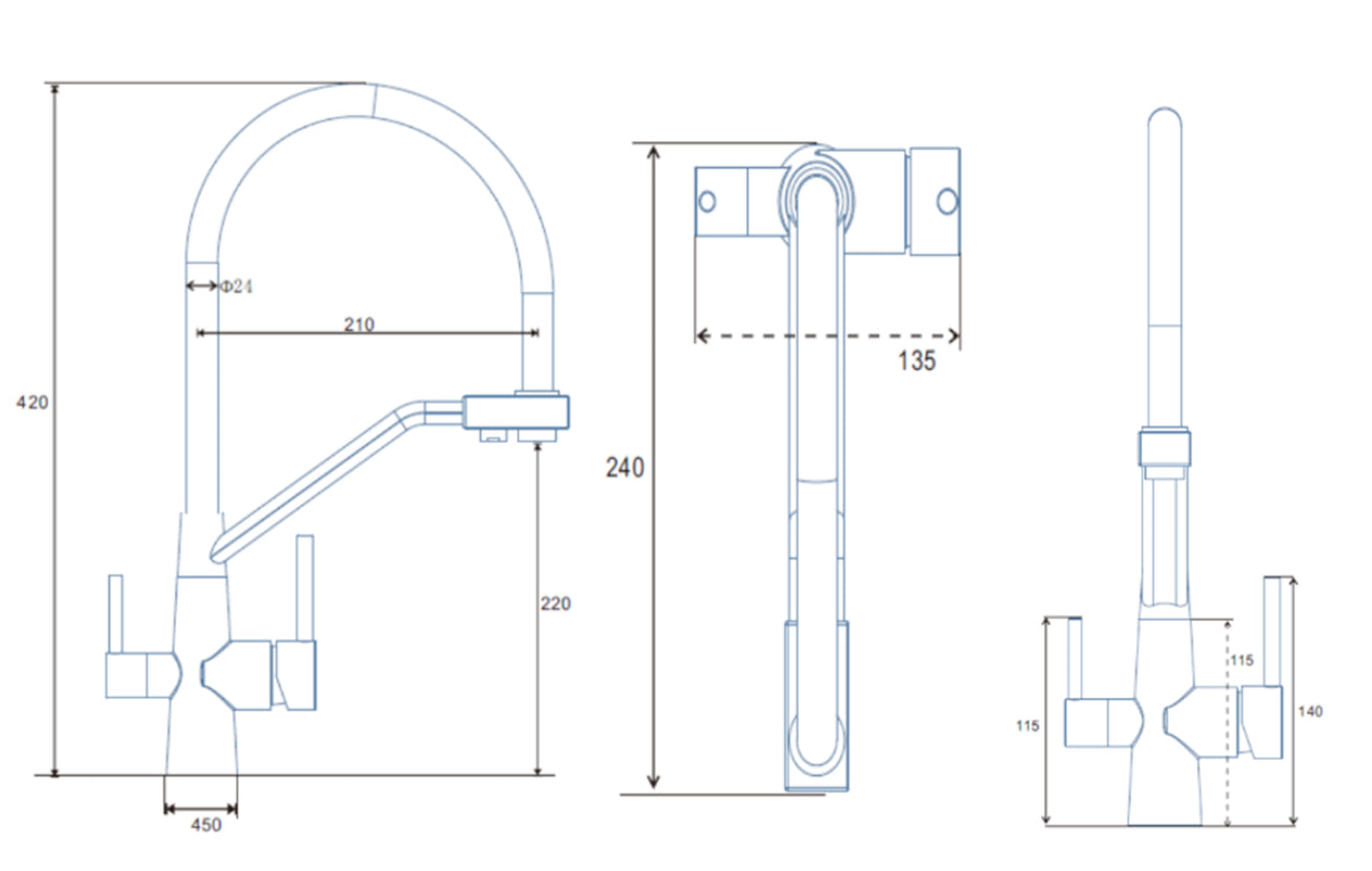 Dieser hochwertige 3 Wege Wasserhahn aus V2A Edelstahl ist die optimale Lösung, wenn Sie keinen zusätzlichen Wasserhahn für den Wasserfilter installieren möchten bzw. können. Mit einer Höhe von 42 cm und einem flexiblem schwarzem Silikonschlauch der von der Halterung gelöst werden kann, gehört er zu den Spitzenmodellen in Funktionalität und Optik. Die 3 Wege-Armatur ist mit einem Nutzwasserauslauf (Kalt- und Warmwasser) und separatem Filterwasserauslauf der sich an einem separaten schwenkbaren Arm befindet ausgestattet. Der größere Mischhebel reguliert das ungefilterte Wasser warm und kalt und der kleinere Regler die Entnahme des gefilterten Trinkwassers. Für alle Untertisch-Trinkwasserfilter aus unserem Sortiment geeignet.