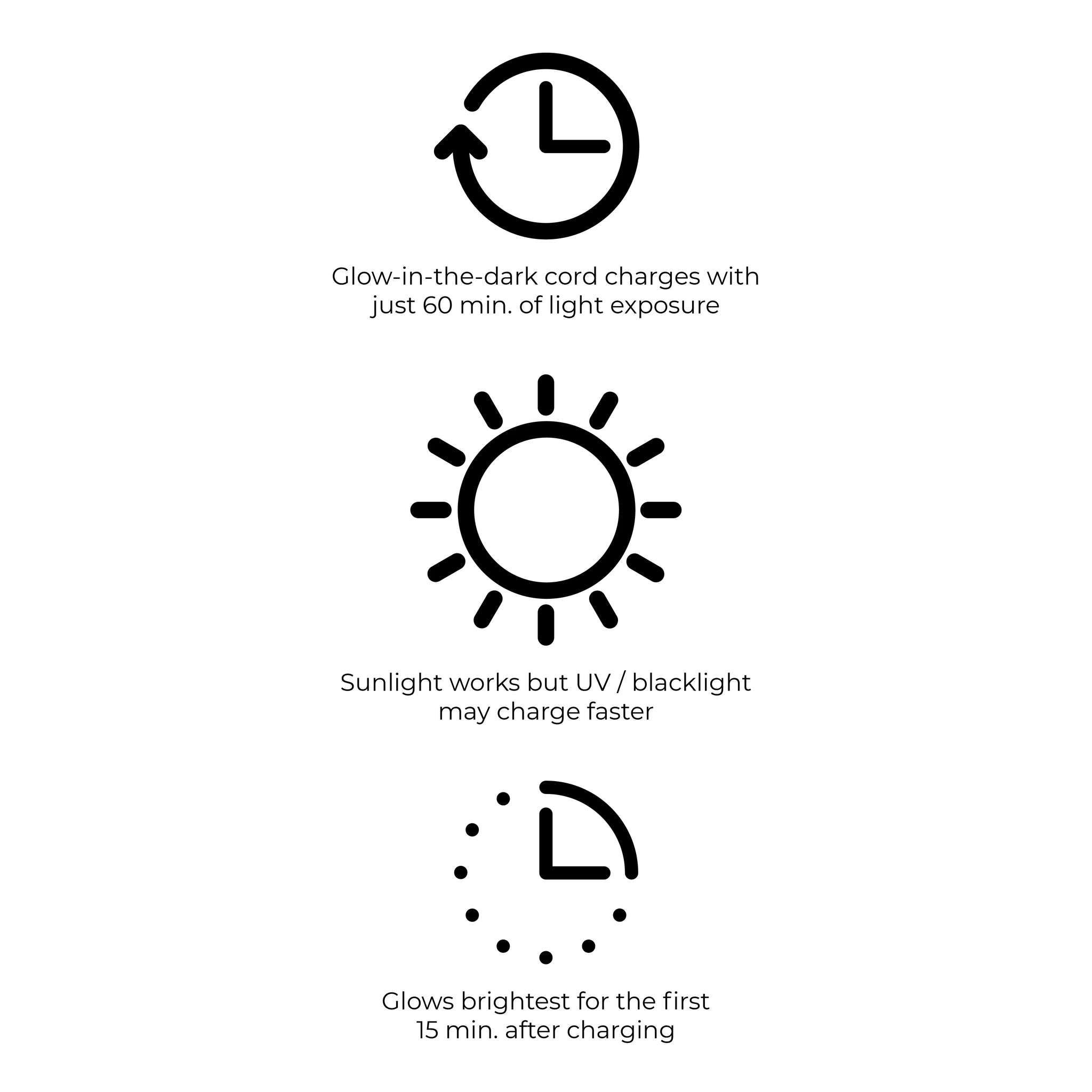 Das im Dunkeln leuchtende Armband lädt sich mit UV-/Schwarzlicht in einer Stunde auf, bei Sonnenlicht kann es länger dauern.