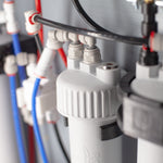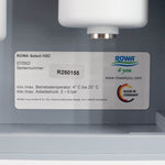 Die ROWA Select kommt in einem schlanken Gehäuse mit nur 11 cm Tiefe (40 cm breit, 48 cm hoch). Der Deckel lässt sich für die Wartung durch Hochschieben lösen und komplett entfernen. Alle Anschlüsse und die Anzeige des anliegenden Wasserdrucks befinden sich auf der Oberseite, so dass die Installation in Ihrem Spülen-Unterschrank sowohl auf der rechten als auch auf der linken Seite möglich ist. Wir empfehlen, das Gehäuse fest an die Seitenwand zu fixieren, damit die Vorzüge der Bajonett-Filtergehäuse bei der Wartung zur Geltung kommen. Der Vorratstank kann flexibel positioniert werden, ggfs. auch in einem anderen Unterschrank, jedoch etwa auf der selben Höhe wie die Anlage.