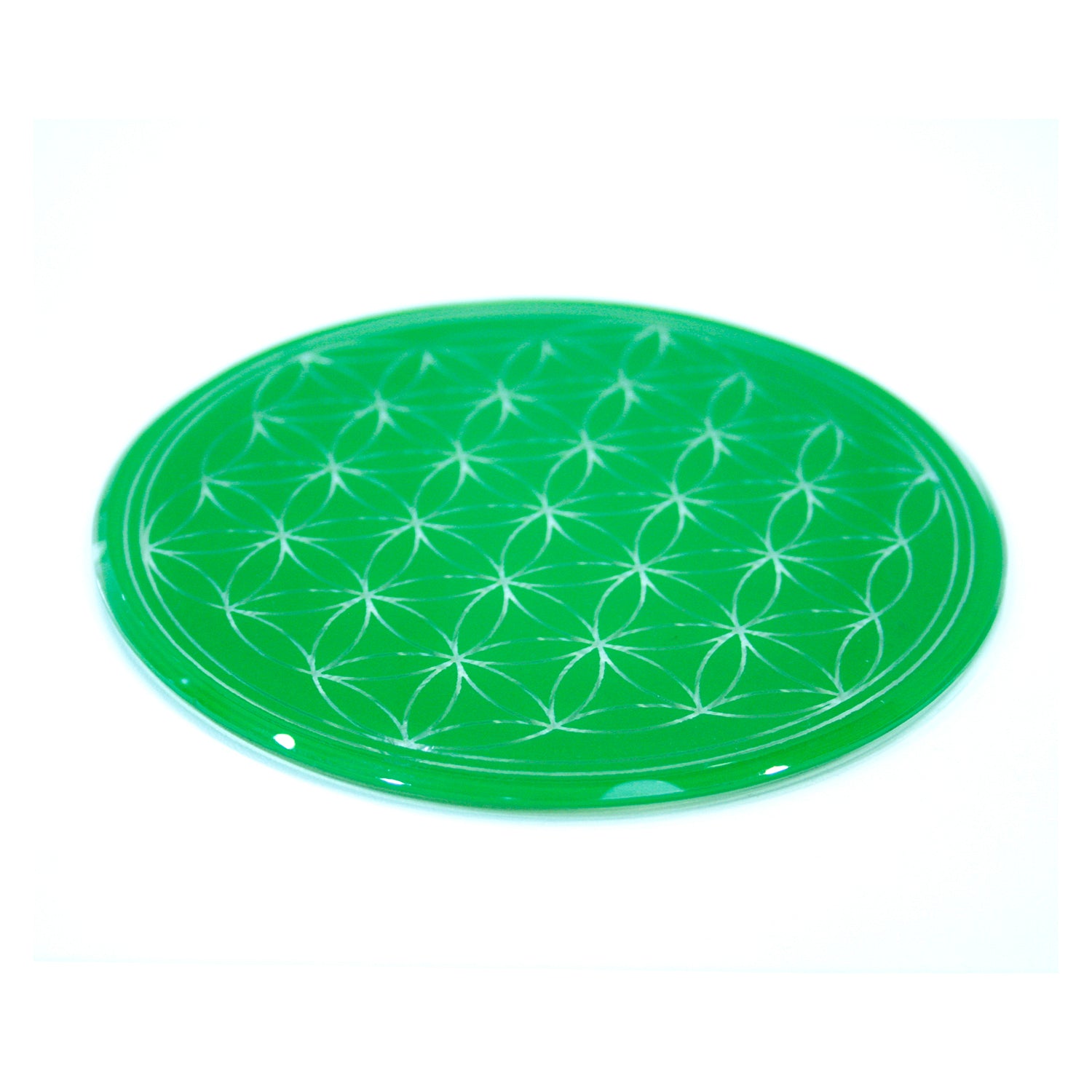 Getränkeuntersetzer aus Kristallglas, mit Lebensblume-Druck in grün.