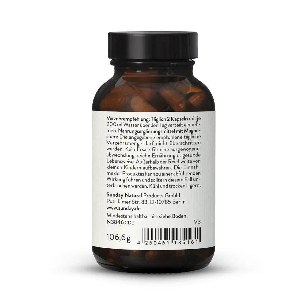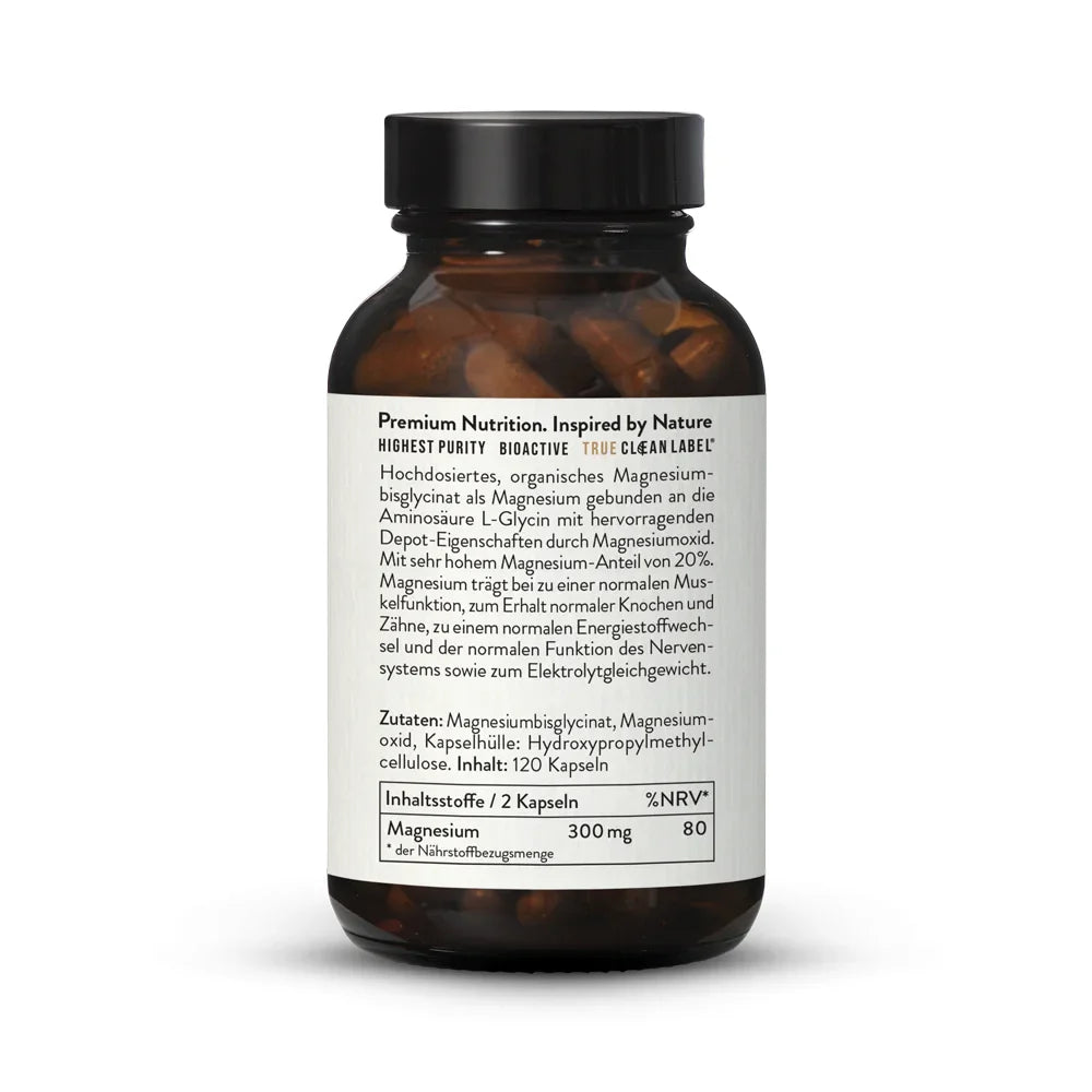 Magnesiumglycinat (als Magnesiumbisglycinat) trägt zu einer normalen Proteinsynthese, einer normalen Funktion des Nervensystems, der Muskeln sowie zur normalen psychischen Funktion bei. Magnesium liegt in einem sogenannten Chelat-Komplex an die Aminosäure Glycin gebunden vor. Das Magnesium kann in dieser molekularen Struktur keine unerwünschten Verbindungen mit anderen Nährstoffen eingehen, so dass jeder Nährstoff in seiner ganzen Breite zur Wirkung kommen kann.