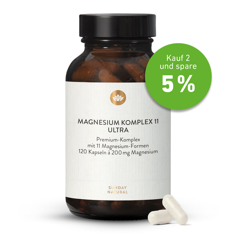 11 Magnesiumformen als hoch verfügbarer, natürlicher Magnesium Komplex ideal für die tägliche Versorgung mit Magnesium. Aus Aminosäure- und Fruchtsäurechelaten, Magnesiumascorbat als gepuffertes Vitamin C, Magnesiumlactat als Verbindung aus Magnesium und Milchsäure sowie ionischen Mineralstoffen aus dem Utah Salzsee (ConcenTrace®*). Ohne Zusätze. Optimale Verfügbarkeit und Versorgung, ohne Gentechnik. 120 Kapseln
