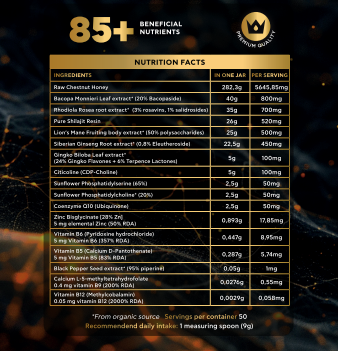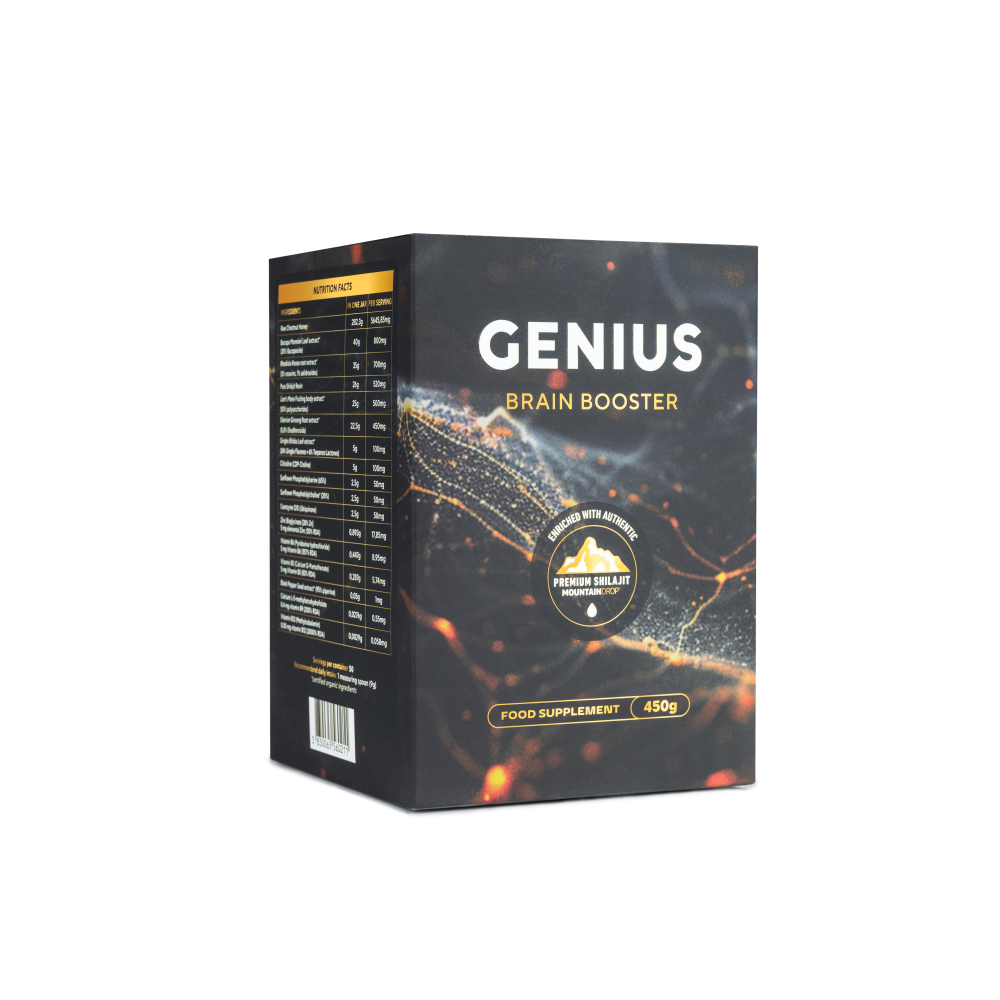 Erleben Sie einen totalen zerebralen Aufschwung mit Mountaindrop® Genius Brainbooster, einer außergewöhnlichen Power-Mischung aus 17 hochwertigen Inhaltsstoffen, darunter unser eigenes Premium Original Shilajit. Wir haben sorgfältig die optimalen und stärksten Inhaltsstoffe kombiniert, um die Gehirnfunktionen zu unterstützen und maximale mentale Energie und reduzierte Müdigkeit zu liefern. Die Messlatte wurde gerade höher gelegt. Dieses natürliche Nahrungsergänzungsmittel zielt darauf ab, neu zu definieren, was ein echter Brain Booster ist, und zwar durch eine einzigartige Formel, die darauf abzielt, Ihre Gehirnfunktionen zu unterstützen und gleichzeitig die mit der Schreibtischarbeit verbundene Müdigkeit zu reduzieren. Genius setzt mit seiner reichhaltigen und umfassenden Formel, die aus 17 hochwirksamen Inhaltsstoffen besteht, die sich gegenseitig ergänzen und zu einem wahren kognitiven Kraftpaket führen, den Standard für erstklassige Brain Booster.
