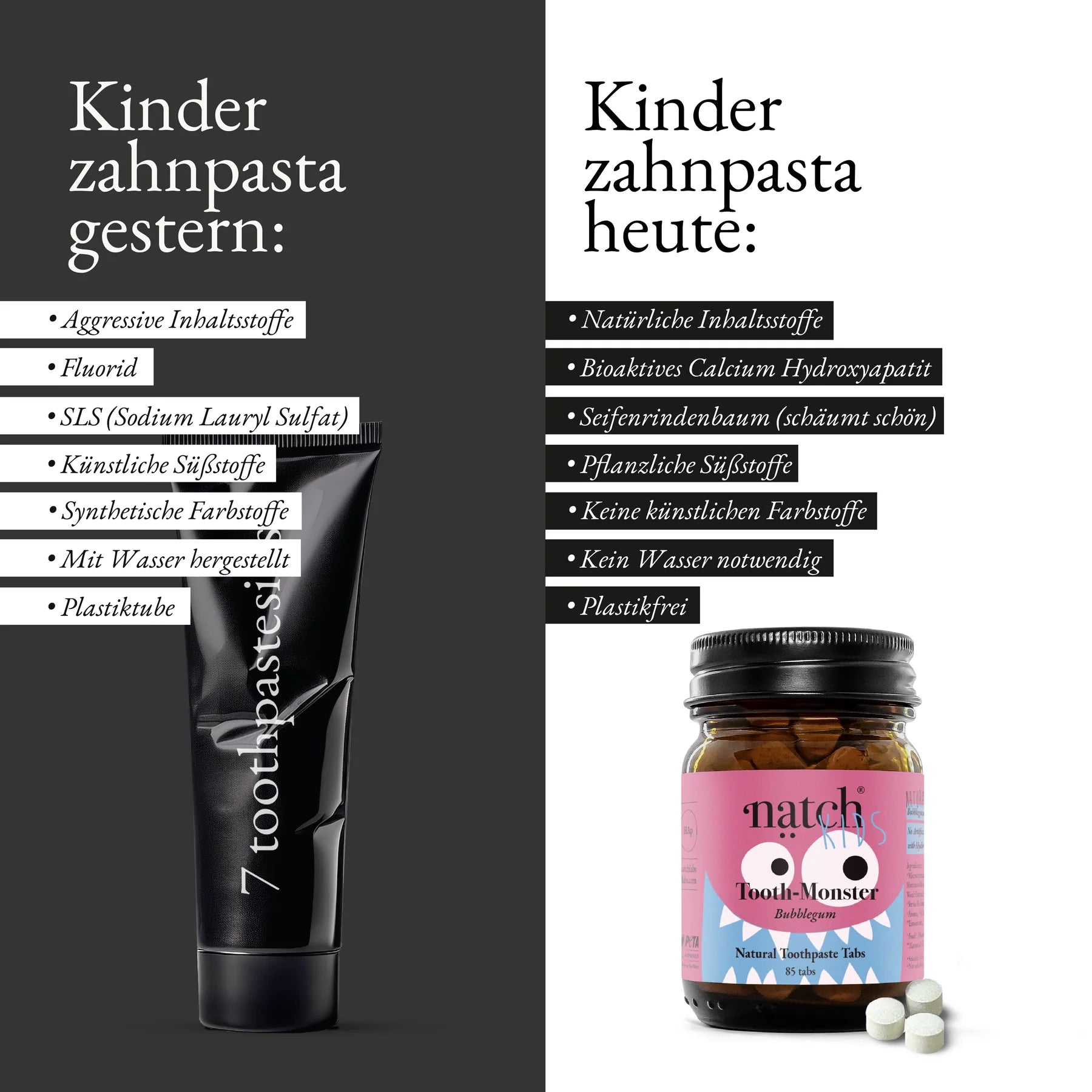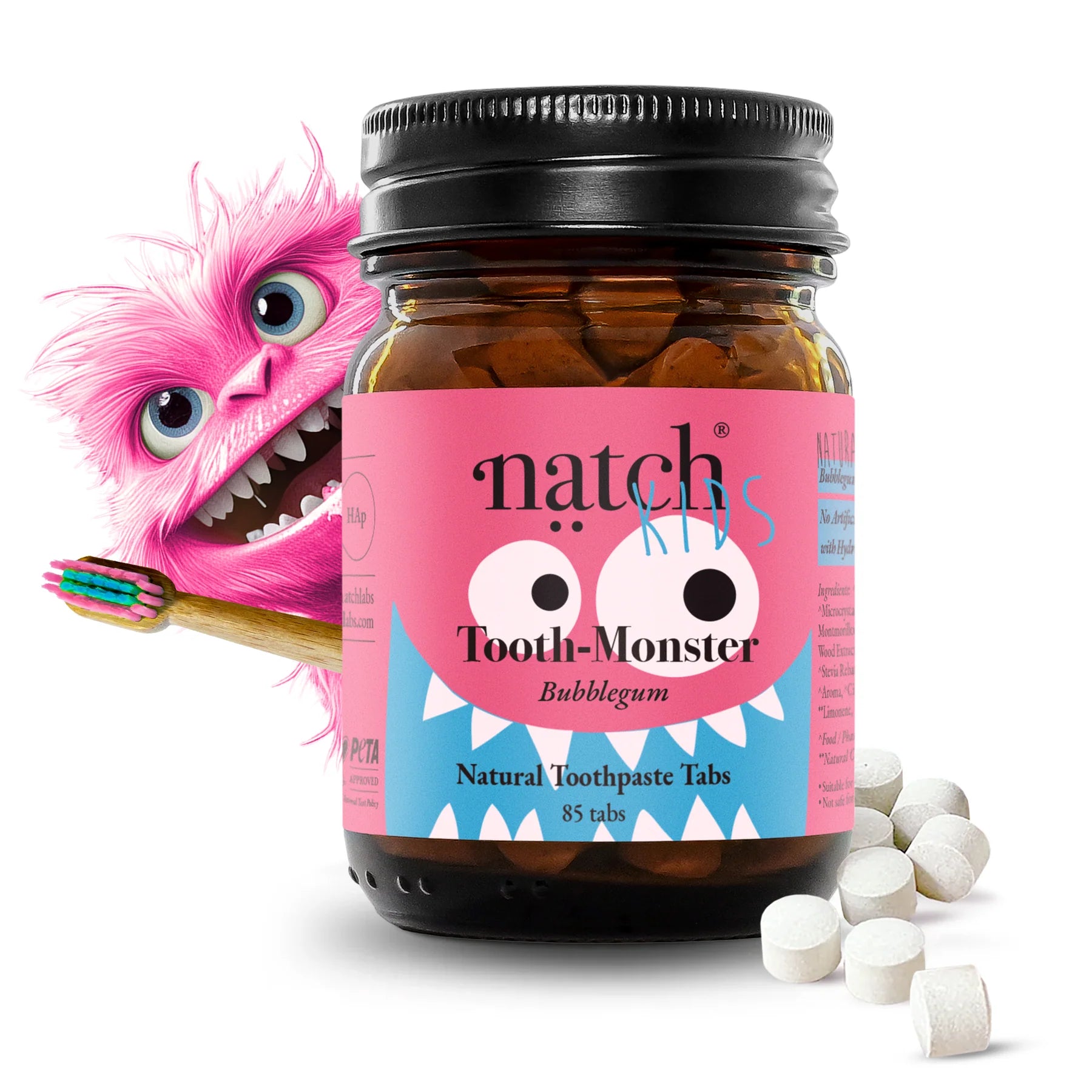 Entdecke die brandneuen Natch Tooth Monster Tabs und mache das Zähneputzen zu einem Abenteuer! Natch Tabs sind ohne Fluorid und stattdessen mit Calcium-Hydroxylapatit (HAP) angereichert, das zum Schutz und zur Remineralisierung der Zähne beiträgt, indem es kleine Risse im Zahnschmelz repariert. HAP ist biokompatibel und unbedenklich, selbst wenn es verschluckt wird.