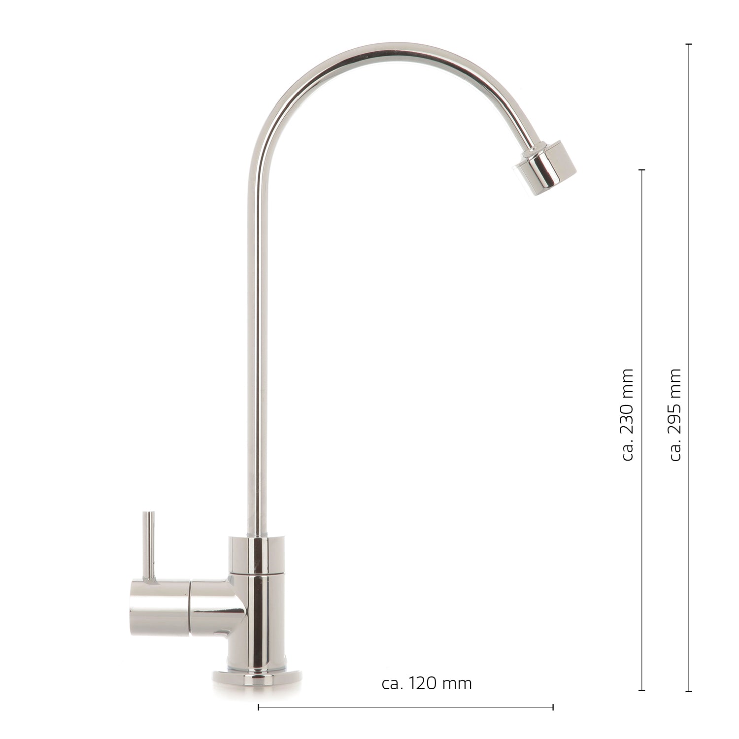 Dieser separate Entnahmehahn inkl. Strahlregler ist verchromt und kommt aus dem Hause Carbonit, er ist ein hochwertiger, universeller, schlicht gehaltener Zweithahn. Ein M22-Gewinde am Auslauf ermöglicht eine Nutzung von Wasserwirblern. Das Filterwasser wird mit einem Drehgriff (1/4-Drehung) bedient. Ein schwenckbares Auslaufrohr ermöglicht die Wasserentnahme in jede Richtung. Für alle Untertisch-Trinkwasserfilter und Filterpatronen aus unserem Sortiment geeignet.