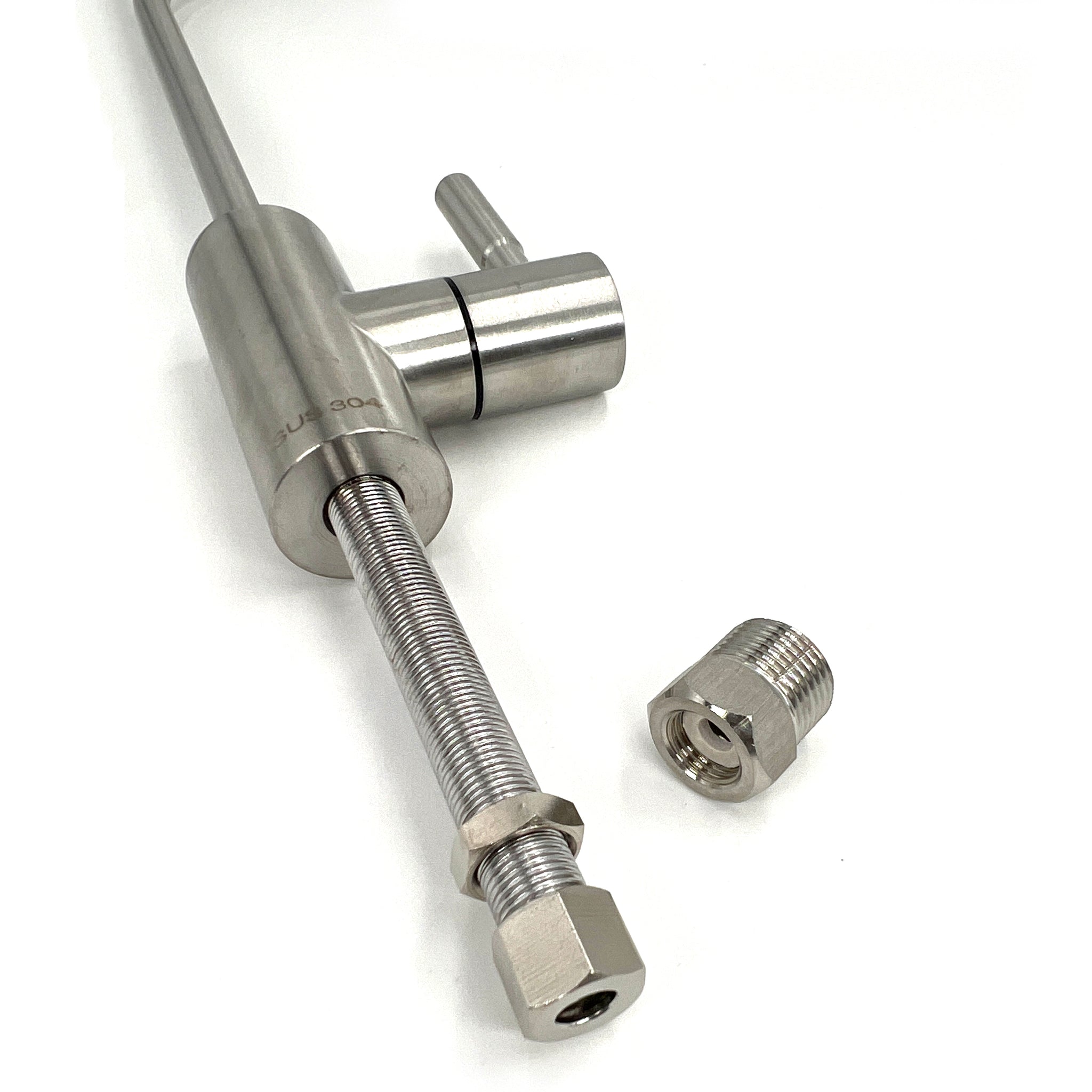 Dieser separater Entnahmehahn aus Edelstahl ist matt gebürstet. Zum Wasserauslauf hin verjüngt sich das Auslaufrohr, dies verleiht ihm zusätzlich das filigrane Design. Das Filterwasser wird mit einem Drehgriff (1/4-Drehung) bedient. Für alle Untertisch-Trinkwasserfilter und Filterpatronen aus unserem Sortiment geeignet.