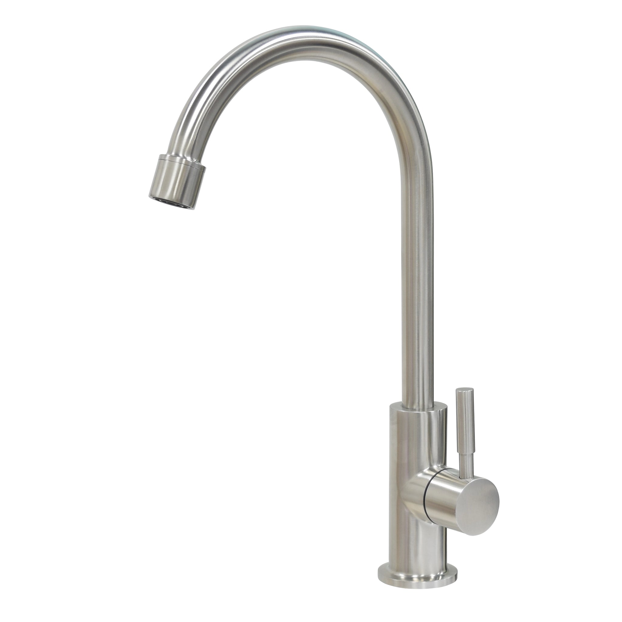 Kräftiger Design-Wasserhahn komplett aus Edelstahl, mit Feingewinde M22 am Auslauf für den Anschluss eines Wasserverwirblers.